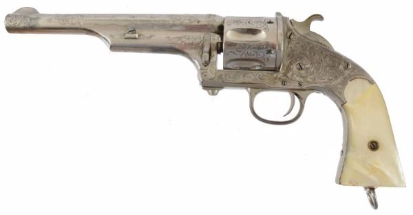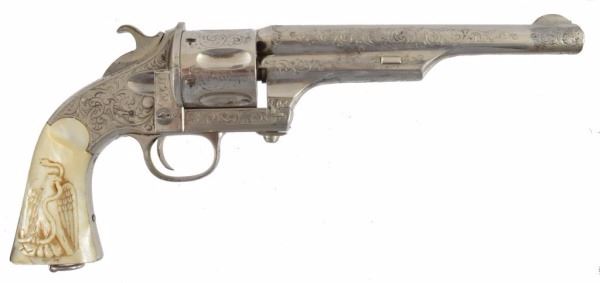 Serial no. 234 .44-40 factory engraved with mother of pearl carved Mexican eagle & snake grips Re-nickeled cylinder.