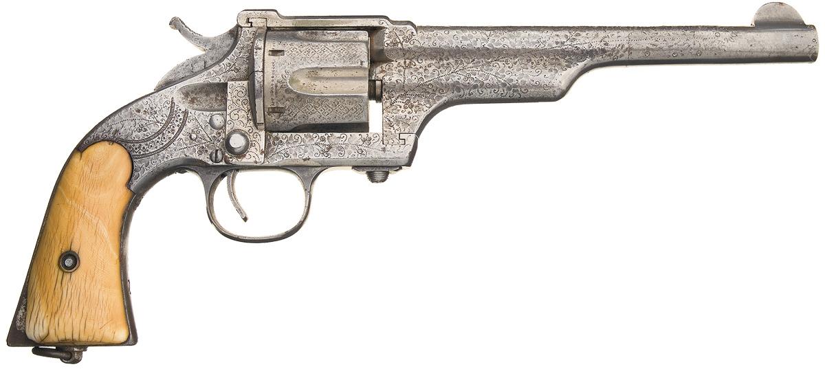 Condition: Good. The metal surfaces have a smooth gray patina with strong original; nickel in protected areas, of the bottom of the barrel, cylinder flutes and recoil shields. There is a small amount of minor pitting on the muzzle end of the barrel, which also shows signs of cleaning. The shrunken undersize grips are fair with a large chip on the right heel, numerous minor age cracks and a pleasant caramel patina. Some markings are not visible, those that are are clear and the engraving is clear. The barrel releases roughly, the cylinder does not lock (and spins freely) but the action functions properly. A colorful Old West revolver!
