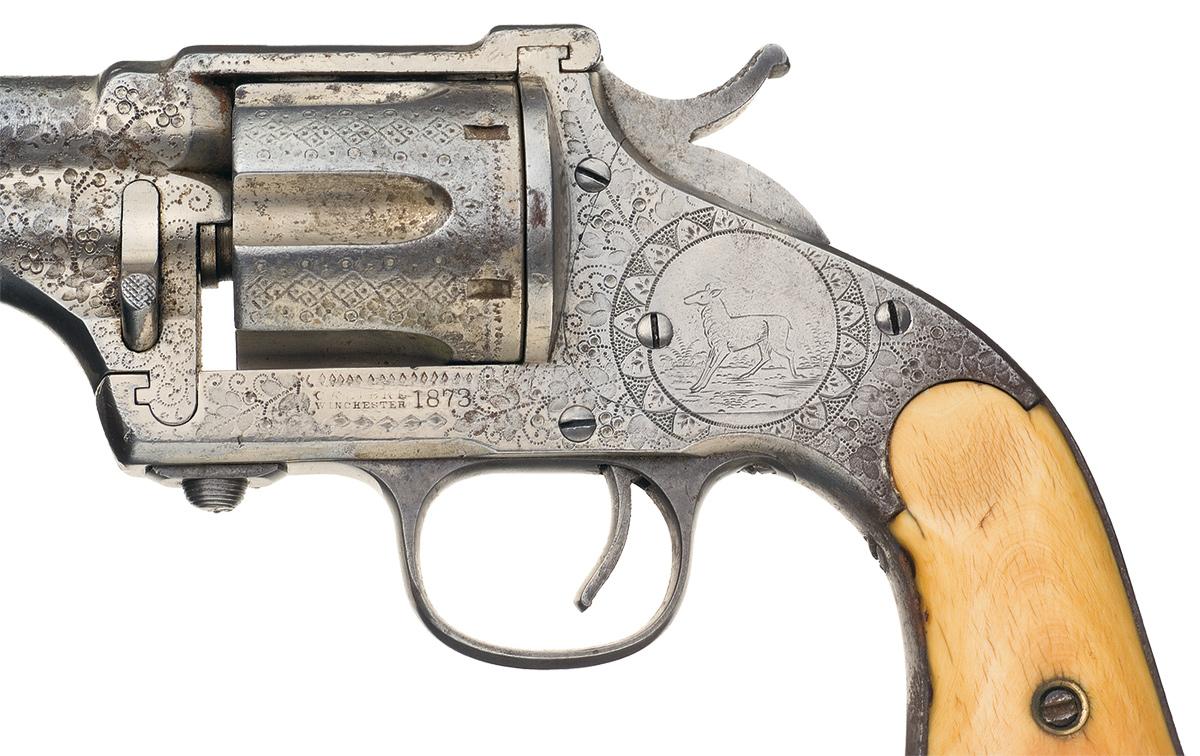 This is an example of a factory engraved Merwin Hulbert 3th Model Single Action Frontier Army Revolver. These revolvers were manufactured in the 1870s and this revolver has the distinctive 3rd Model round barrel with top strap, fluted cylinder and square butt with lanyard ring. Visible on top of the barrel is "15, 74, AUG 3, 75 JULY 11, 76, APR. 17, 77 Pats Mar 6, 77"". The left side of the frame below the cylinder is marked with the two-line caliber designation: "CALIBRE / WINCHESTER 1873" (the designation for 44-40 caliber), and the serial number "21819" is stamped on the bottom of the butt behind the lanyard loop and "606" is stamped on the rear face of the barrel lug and on the rear face of the cylinder. The revolver is nickel finished with a casehardened hammer, trigger, trigger guard and barrel assembly release button and features the distinctive factory punch dot engraving with a deer on the left side plate in a round panel. The revolver is fitted with smooth two piece ivory grips.