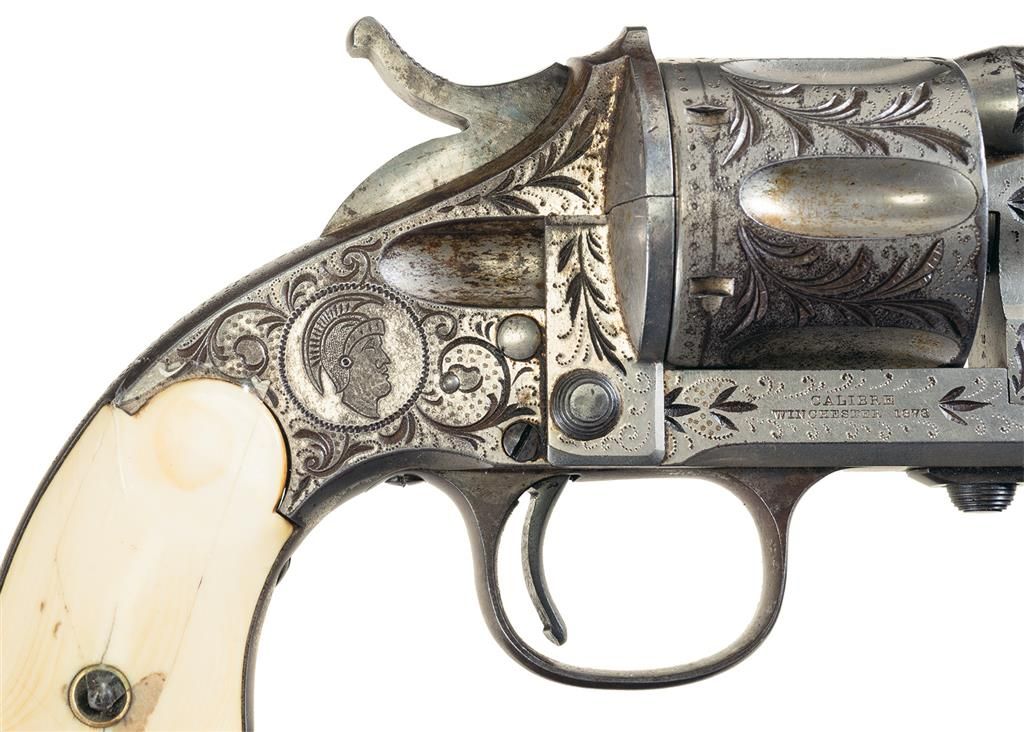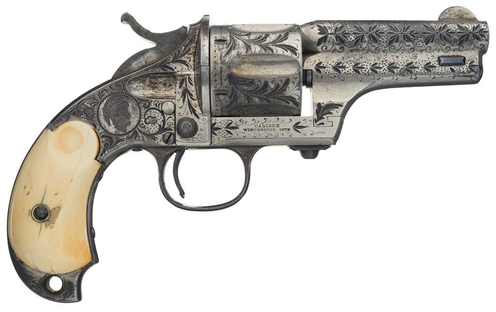 Manufactured in the late 1870s early 1880s, this Merwin Hulbert & Co. Pocket Army single action revolver features a round barrel, fluted cylinder, no top strap and bird's head butt with lanyard hole. The revolver is profusely engraved with the distinctive Merwin Hulbert & Co. style. The right side of the frame under the cylinder is marked "CALIBRE/WINCHESTER" followed "1873", (the designation for caliber 44-40), and the left side of the frame is marked "MERWIN HULBERT & CO. N.Y./POCKET ARMY". The left side of the barrel has the two-line Hopkins & Allen address/patent date marking. The barrel, frame sides and top of the back strap feature a fine floral vine and punch dot engraving. The cylinder flats, loading gate and the barrel lug sides feature a floral leaf and punch dot pattern. In addition the left side of the frame has a game bird scene in a panel and there is the head of a Centurion in a circle on the right side. The matching serial number is stamped on the left side of the frame under the grip, on the rear face of the cylinder, on the cylinder pin and on the back of the barrel lug. Blade front sight and "V" notch rear sight integral to the recoil shield, all nickel finish and fitted with smooth ivory grips. The inside of the right panel is marked "James O Love/Newark Mo" in pencil.