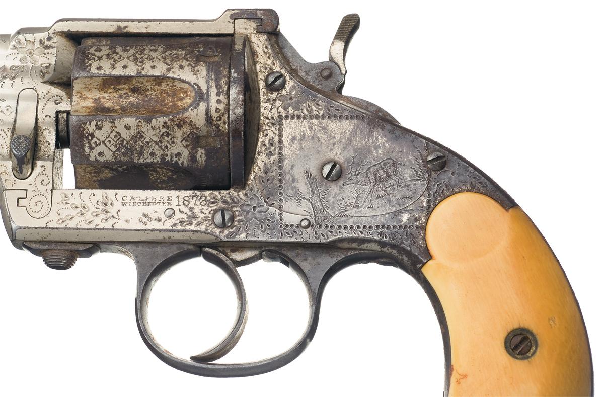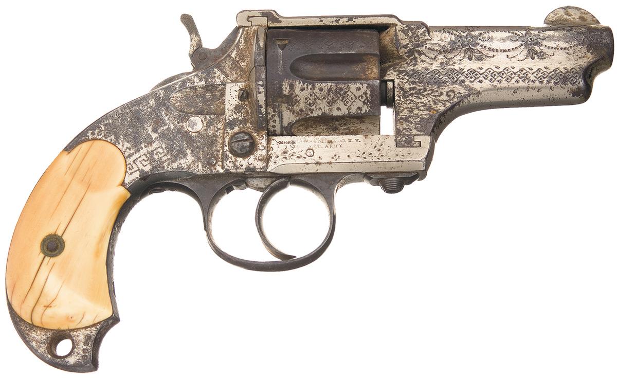 Condition: Fine. The revolver retains 50% of the original nickel finish with the exposed areas having an untouched brown patina. The backstrap has some moderate oxidation and there is some minor oxidation on the cylinder. The grips are very good with some high point wear, a few age cracks on both panels and have aged to an attractive mellow caramel patina. The frame markings are beginning to fade, otherwise the markings and engraving are clear. The action is fine but is slightly loose. This is a very colorful, original factory engraved Merwin Hulbert Pocket Army DA Revolver!