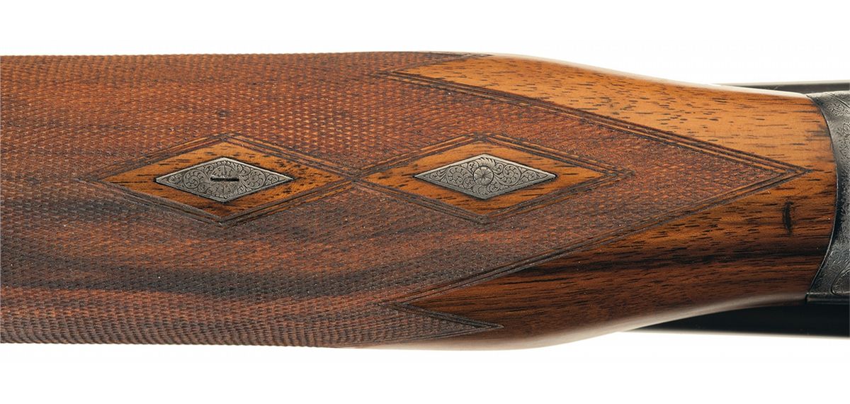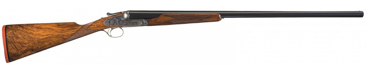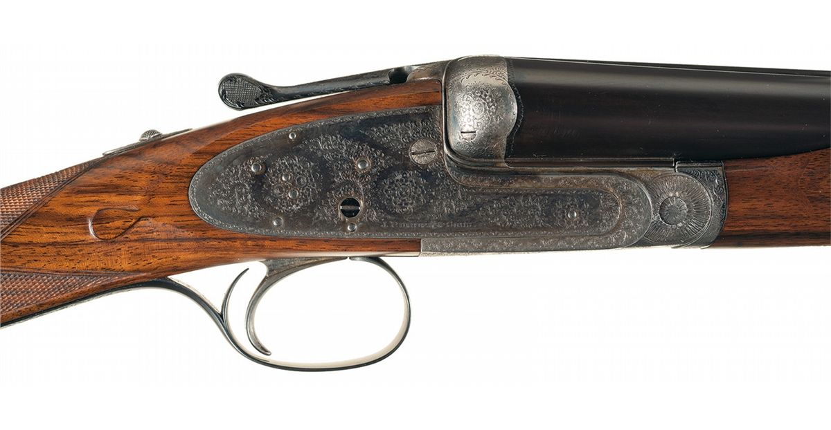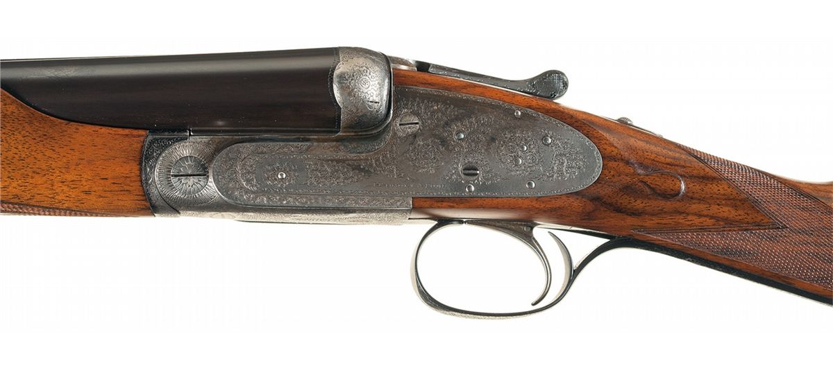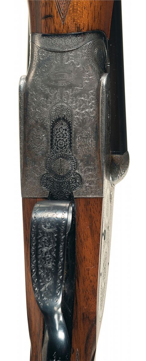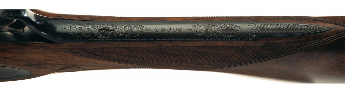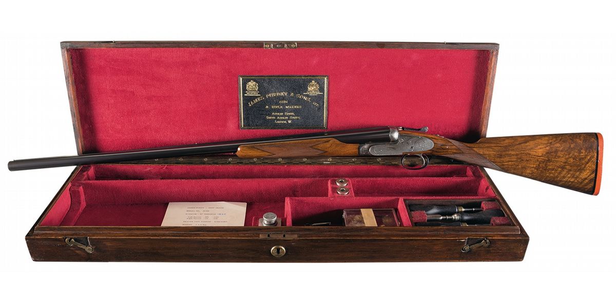 Brass front and ivory mid bead sights on the solid concave matte rib. The top of the left barrel near the breech is marked "J. PURDEY & SONS" and "AUDLEY HOUSE. SOUTH AUDLEY STREET. LONDON, ENGLAND" on the right barrel. The underside of each barrel is marked with the matching serial number and the flats are marked with "NITRO PROOF, "12", various English proofs"1 1/4", "2 3/4'" and "12/C" in a diamond. The water table is marked with two "crown/V" proof marks. The frame, side plates, trigger guard, break lever and forearm hardware are engraved with fine English scroll, with the addition of rose bouquets on the side plates and frame. Each side plate is marked "J. PURDEY & SONS" and the underside of the frame is marked "J. PURDEY & SONS/LONDON/ENGLAND". The serial number is marked on the lower tang. 2 3/4 inch chambers, choked light full/extra full with ejectors. Single trigger, cocking indicators, tang mounted manual safety with gold "SAFE", casehardened frame and side plates with blue remaining parts and mounted with a nicely figured multi-point checkered walnut beavertail forearm and straight grip stock with teardrop flats, solid recoil pad and silver initial oval. Comes in a walnut case with red velvet lining and Purdey label affixed to the inside of the lid. In the case is a three piece wooden cleaning rod, cleaning rod attachments, nickel Purdey and matching serial number marked oiler, a firing pin tool numbered to the gun, two screwdrivers numbered to the gun, a key and two nickel snap caps. 2 3/4 inch chambers, bore diameter: R- .730 L- .726, bore constriction: R- .032 L- .042, min. bbl thickness: R- .30 L- .35; length of pull: 14 1/2 inches, drop at comb: 1 1/2 inches, drop at heel: 2 inches, cast-off: ¼ inches, weight: 7lbs 12oz.
