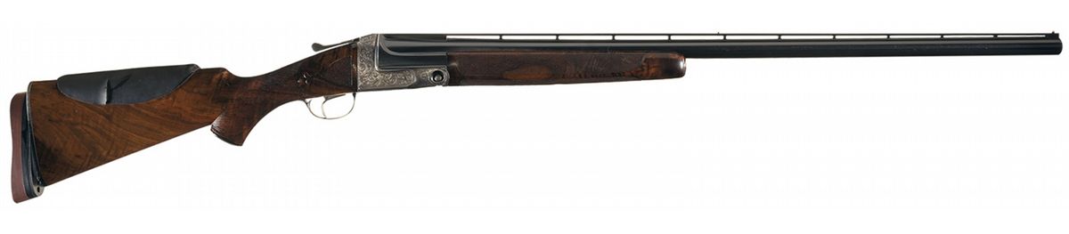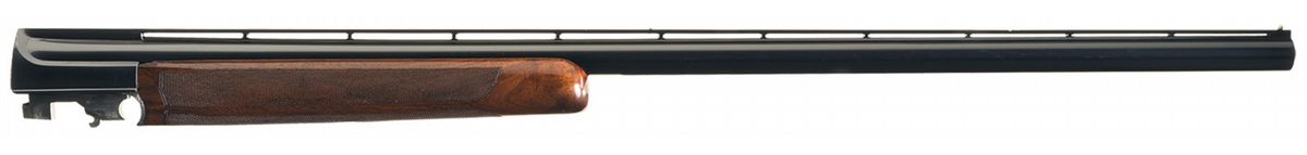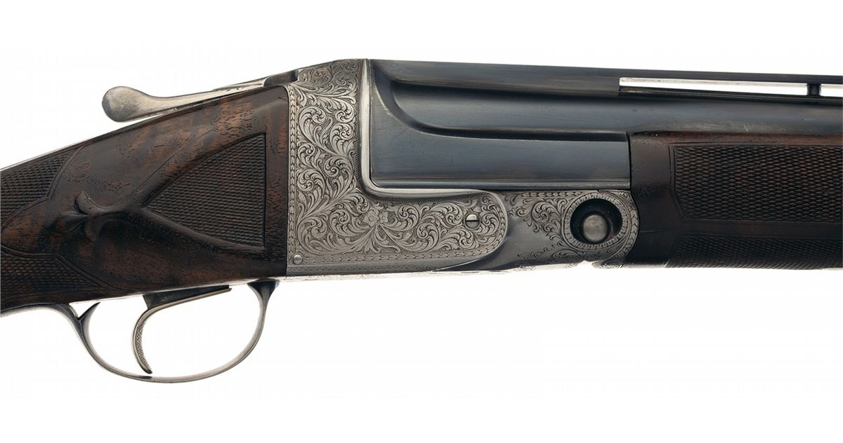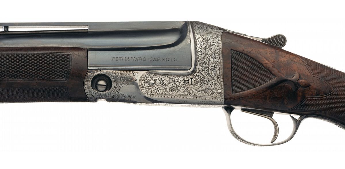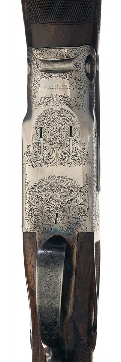 Manufactured after 1934. There is beautifully executed floral scroll engraving on the receiver, trigger plate, trigger guard, break lever and forearm hardware. There is also a floral bouquet engraved on the trigger plate. The first barrel is stamped with a "1" on the forearm lug, is stamped with the matching serial number on the bottom flat along with the weight of "3 10", the choke marking "FULL" (measures .036) and with the Remington date codes of "XTT3", "OJ" and "PK3". The second barrel is engraved on the left side of the barrel shoulder "FOR 16 YARD TARGETS", is stamped with a "2" on the forearm lug, is stamped with the matching serial number on the bottom flat along with the weight of "3 10", the choke marking "IMP. MOD" (measures .021) and with the Remington date codes of "LTT3", "PK3" and "XTT3". Both barrels have two ivory bead sights and a 2 3/4 inch chamber with an ejector. Mounted on a nicely figured, checkered semi-beavertail walnut forearm numbered to the gun with a "1" stamped above the serial number. There is a second matching forearm stamped with a "2" above the serial number. The pistol grip stock has checkered flats with carved Fleur-de-Lis accents, a hard rubber grip cap with blank gold inset initial panel, a Cheek-Eez pad is installed on the comb and there is a Kick-Eez recoil pad on an aluminum pad adjuster. Length of pull is 14 1/8 inches.