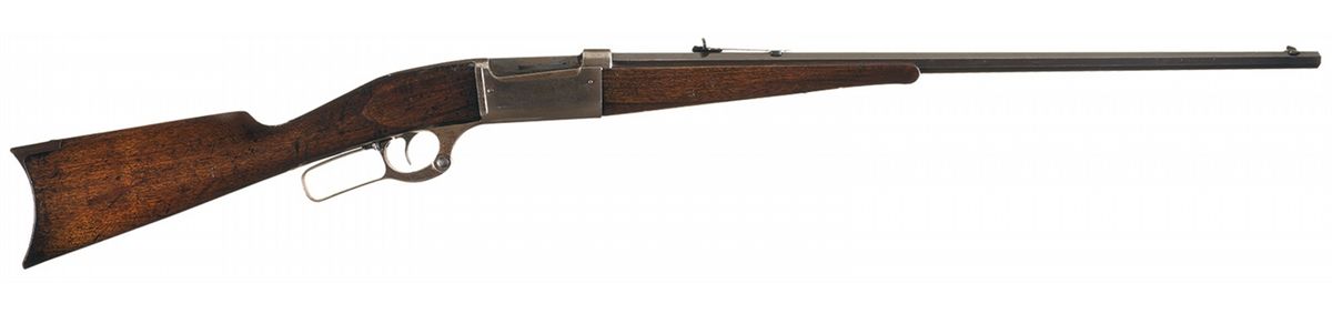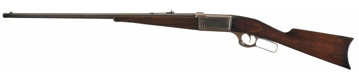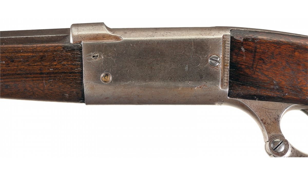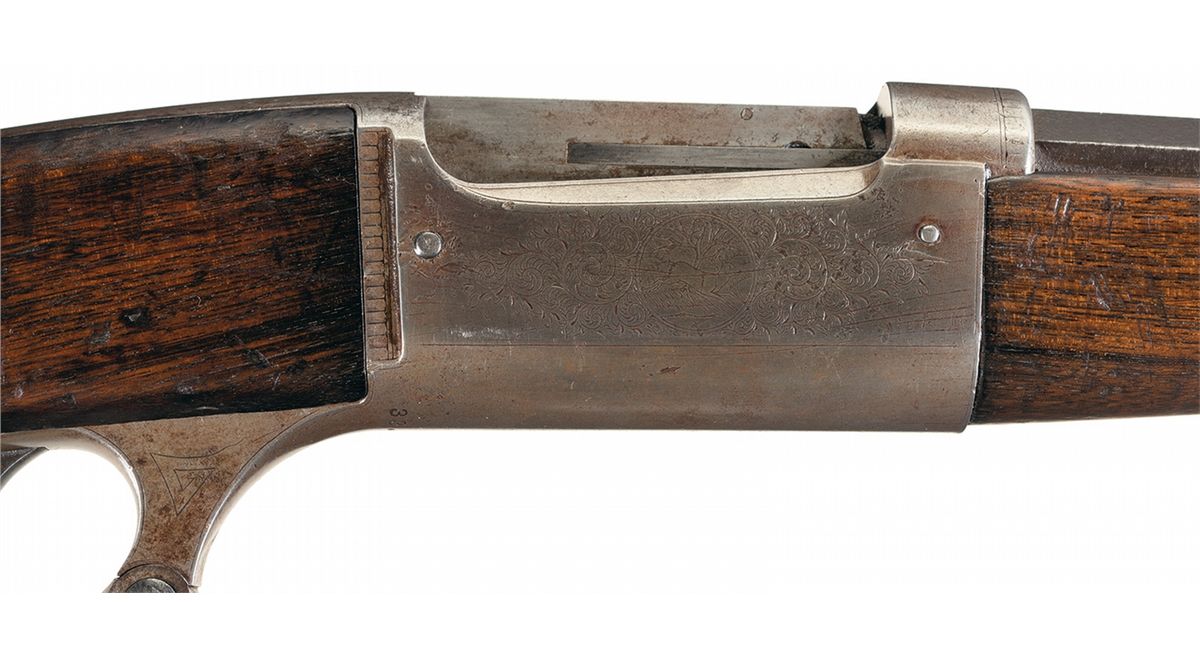 This example was manufactured circa 1902. It has factory "Grade B" engraving with the left side of the receiver showing a buck whitetail deer kneeling in a grassy field with his head held high inside a circle with floral scroll engraving around it. The right side shows a doe running in a field with a tree in the background in a circle with floral scroll engraving around it. There is a blade front sight and an elevation adjustable rear sight. The top tang is tapped for a rear peep sight. Mounted on a smooth walnut forearm and straight grip stock with curved steel buttplate.