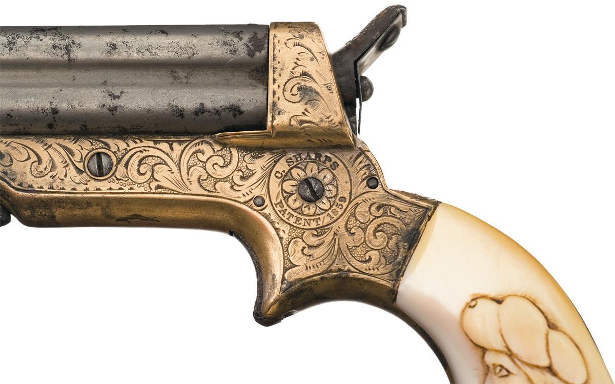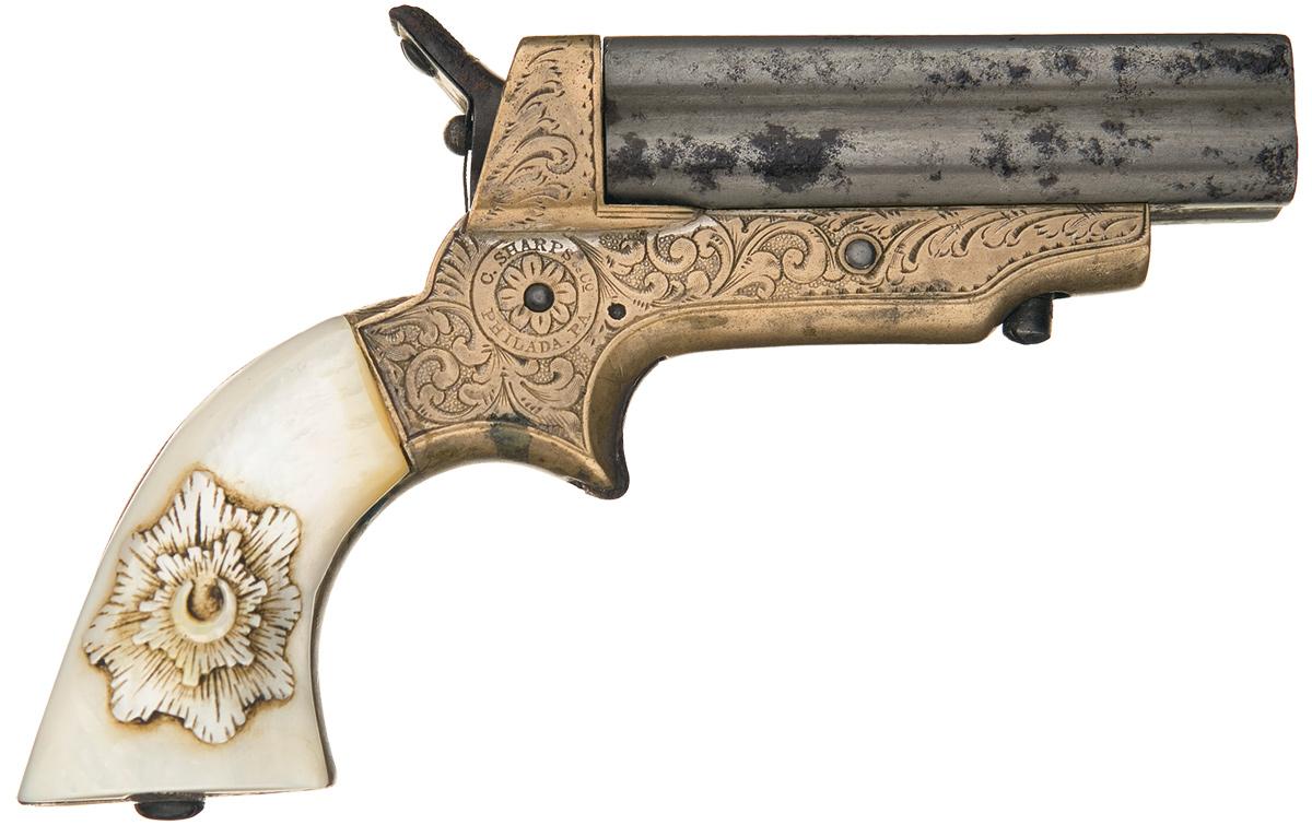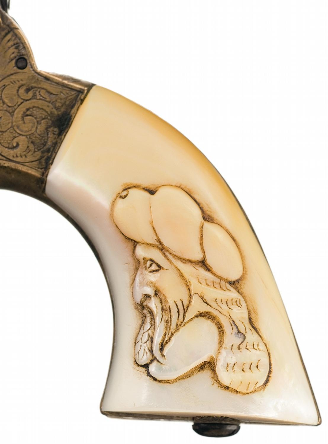 Manufactured between 1859 and 1874. The frame features nice floral scroll engraving, with a punch dot background and a scalloped border on the breechblock. The backstrap has floral scroll designs and there are simple line, scallop border and burst designs on the butt. The left side of the frame is marked "C. SHARPS / PATENT 1859" and the right side "C SHARPS & Co. / PHILADA. PA". There is a floral pattern in the center of each marking. The matching serial number is marked on the bottom of the barrels and on the butt. The frame was silver plated and the remaining parts blue. The pistol is fitted with relief carved pearl grips with the silhouette of a bearded man wearing a turban on the left side and Turkish Crescent in the center of burst patterns on the right. The consignors notes state that this pistol was owned by a Sultan of Turkey and that the bust is the Sultan and his crest is on the opposite. Some research may prove interesting.