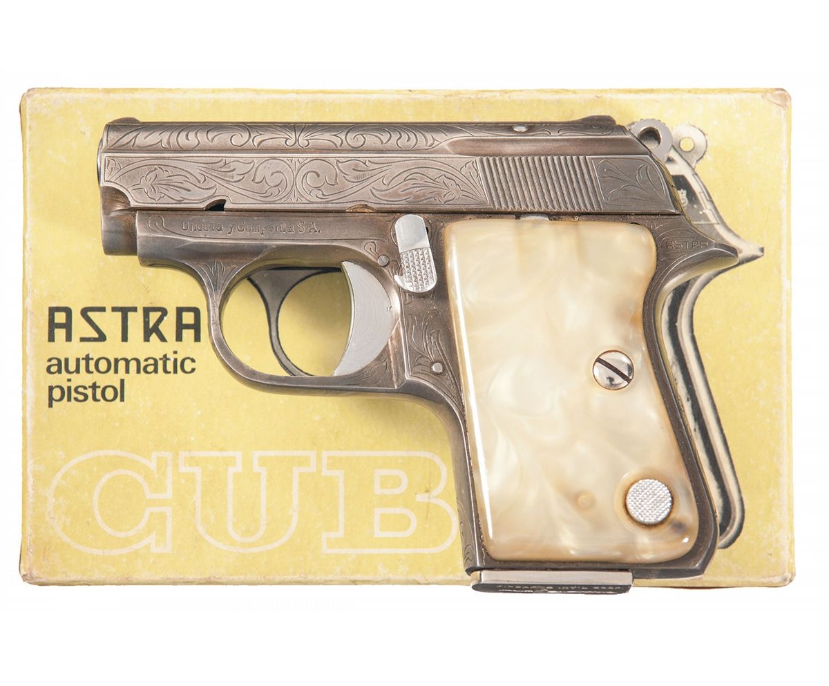 This silver plated Cub 2002 pistol features an extensive factory engraved floral pattern on the slide which extends to the frame sides and grip straps. The pistol has factory markings and proofs on both sides of the frame with matching numbers on slide and frame. Fitted with simulated pearl grips and a firearm International Corp. nickel plated magazine. The factory box is numbered to the gun and comes with a manual and cleaning rod.