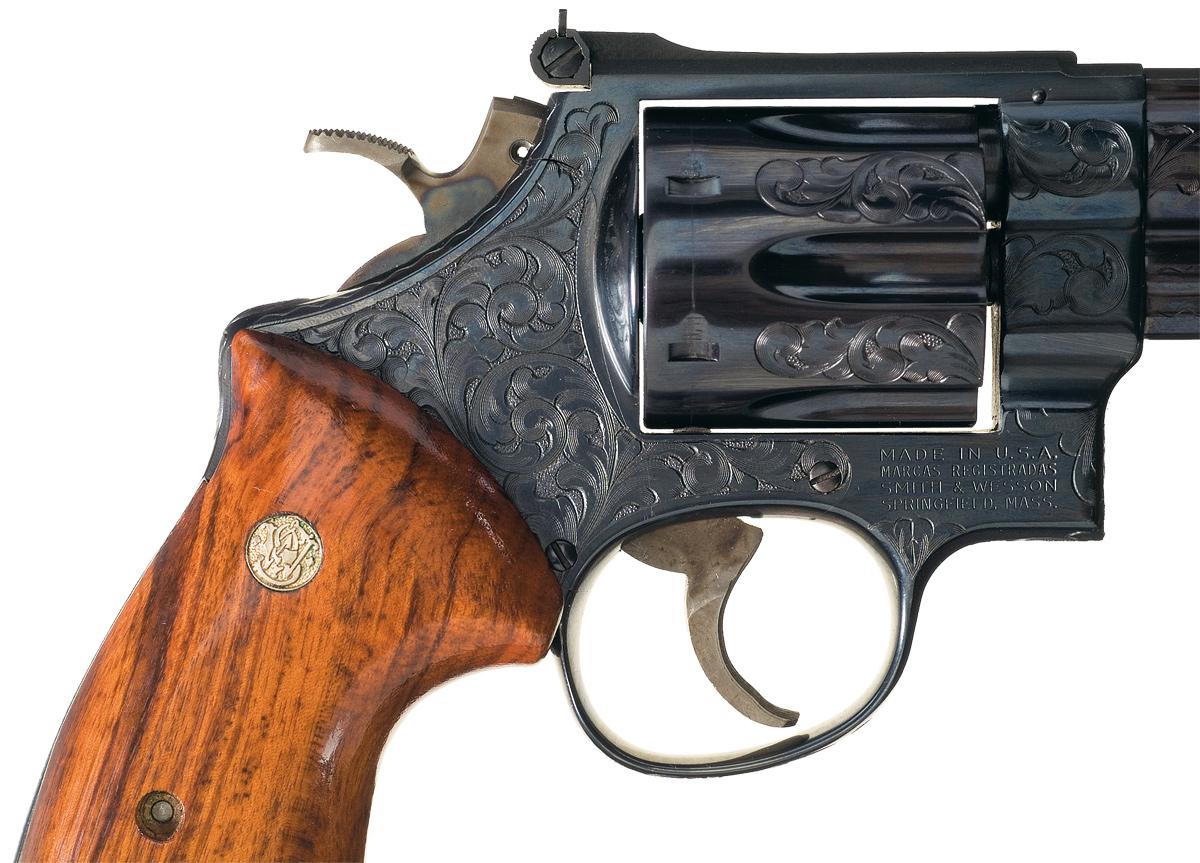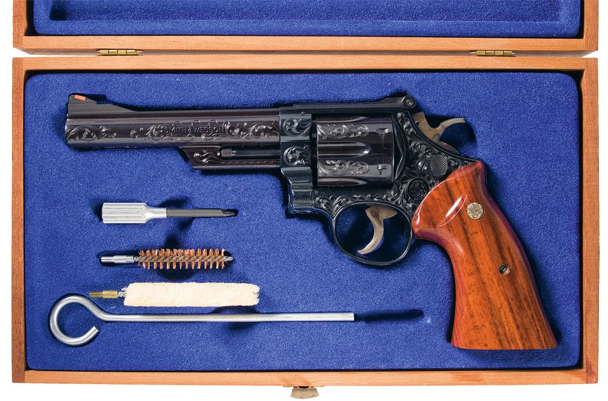 This Model 29-2 revolver features a 6" barrel and a factory class A engraving. The sides of the frame feature a well executed broad floral scroll engraving, with wedges of the engraving on the cylinder chambers. The frame has the standard S&W logo on the left side and address on the right side. The scrollwork featured on the frame is also exhibited on the barrel, with the engraving surrounding the "SMITH & WESSON" marking on the left side and the "44 MAGNUM" marking on the right side, with engraved wedges at the muzzle. Additional engraved wedges are found behind the hammer and on the trigger guard. The revolver is equipped with an adjustable rear sight and a ramp blade front sight with orange insert. Blue with casehardened target hammer and trigger and smooth S&W medallion target grips. Complete with a wooden case and cleaning rod with bore brushes.