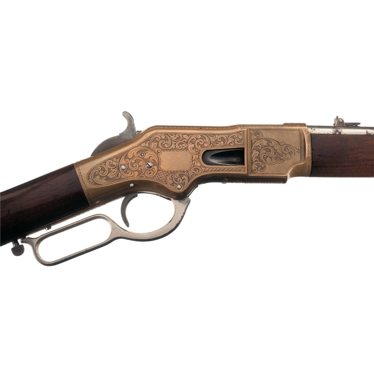 This Factory Engraved Winchester Third Model 1866 Carbine was manufactured in 1871. The carbine has a round barrel and full-length magazine, front barrel band with integral front sight and early style, two leaf, carbine rear sight. A sling ring is mounted on the left side of the receiver. The stock has a an early style brass, crescent buttplate with hinged trap. The barrel, magazine, barrel bands and lever are nickel-plated. The stock and forearm are varnished walnut The top of the barrel is roll-stamped with the two-line legend: "WINCHESTER'S-REPEATING-ARMS.NEWHAVEN.CT./KING'S-IMPROVEMENT-PATENTED-MARCH.29. 1866.OCTOBER 16.1860" ahead of the rear sight. The serial number, "79791", is stamped on the lower tang behind the trigger. The receiver is decorated with Germanic Scroll engraving on a punch-dot background. The engraving covers the top and bottom of the receiver, and the upper and lower tangs. The left side plate has a novel panel with the Mexican Eagle. The right side plate has an engraved inscription plate. The cartridge elevator is engraved with crossing with dots and double line borders. The edges of the receiver and tang are engraved with wavy line borders and there are double line borders abound the engraving on the sides of the receiver. The top of the buttplate heel is engraved with open scroll work on a punch-dot background with wavy line borders.