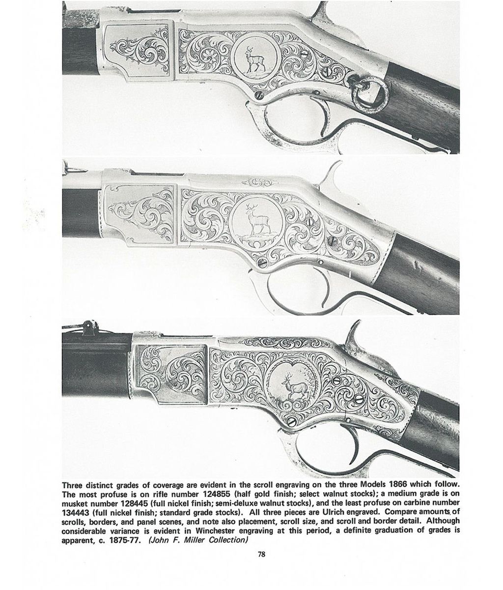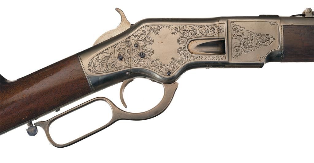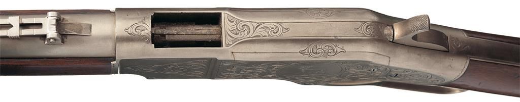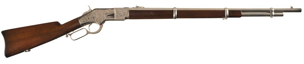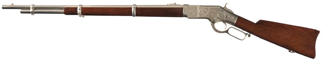Manufactured in 1875. The Third Style musket has the serial number located on the lower tang behind the trigger and receiver with flare at the junction with the forearm. The musket has the distinctive features that include a 27 inch round barrel, 24 inch magazine, 17 inch forearm, block style front sight base that serves as a base for a socket bayonet, three barrel bands, carbine style buttplate and sling loops located on the middle barrel band and stock. The buttplate has a sliding brass trap door with trap that contains a four piece jointed steel cleaning rod. The barrel has a non-standard folding leaf rear sight with external spring. The sight features a small 1 5/16 inch long sight leaf with un-numbered range graduations. The top of the barrel is roll stamped with the legend "WINCHESTER'S-REPEATING-ARMS-NEWHAVEN. CT./KING'S-IMPROVEMENT-PATENTED-MARCH 29. 1866. OCTOBER 16. 1860." ahead of the rear sight. The serial number "128445" is stamped in block numerals on the lower tang behind the trigger. The musket has a full nickel plated finish with varnished straight grain American walnut stock and forearm. The receiver, cartridge elevator and buttplate heel are decorated with Winchester Style 2 engraving. The engraving features Germanic scrollwork on a punch dot background with scallop and dot borders. The right side plate is engraved with an open inscription scroll and the left side plate has a detailed white tail buck in a round panel. Identical engraving identified as the work of John Conrad or Herman Ulrich is illustrated on page 78 of THE BOOK OF WINCHESTER ENGRAVING by R.L. Wilson. A nickel plated Winchester 1866 Musket with similar Ulrich engraving (serial no. 134957) is pictured on page 77 of THE BOOK OF WINCHESTER ENGRAVING. The combination of factory engraving and nickel plating on a Winchester 1866 Musket is rare. The accompanying factory letter verifies the musket configuration, engraved, nickel plated, that it was received in the warehouse on February 11, 1876 and shipped to order number 2726 on February 25, 1876.