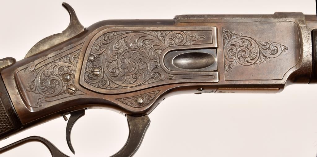 SN 21XXX, mfd 1877. 28" octagon barrel .44-40 caliber with deluxe wood, set trigger, tang peep sight.
