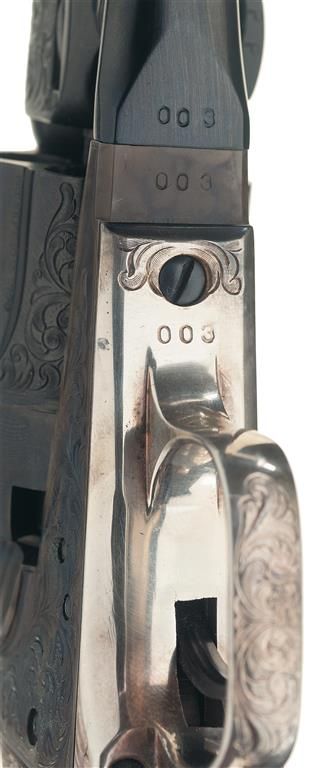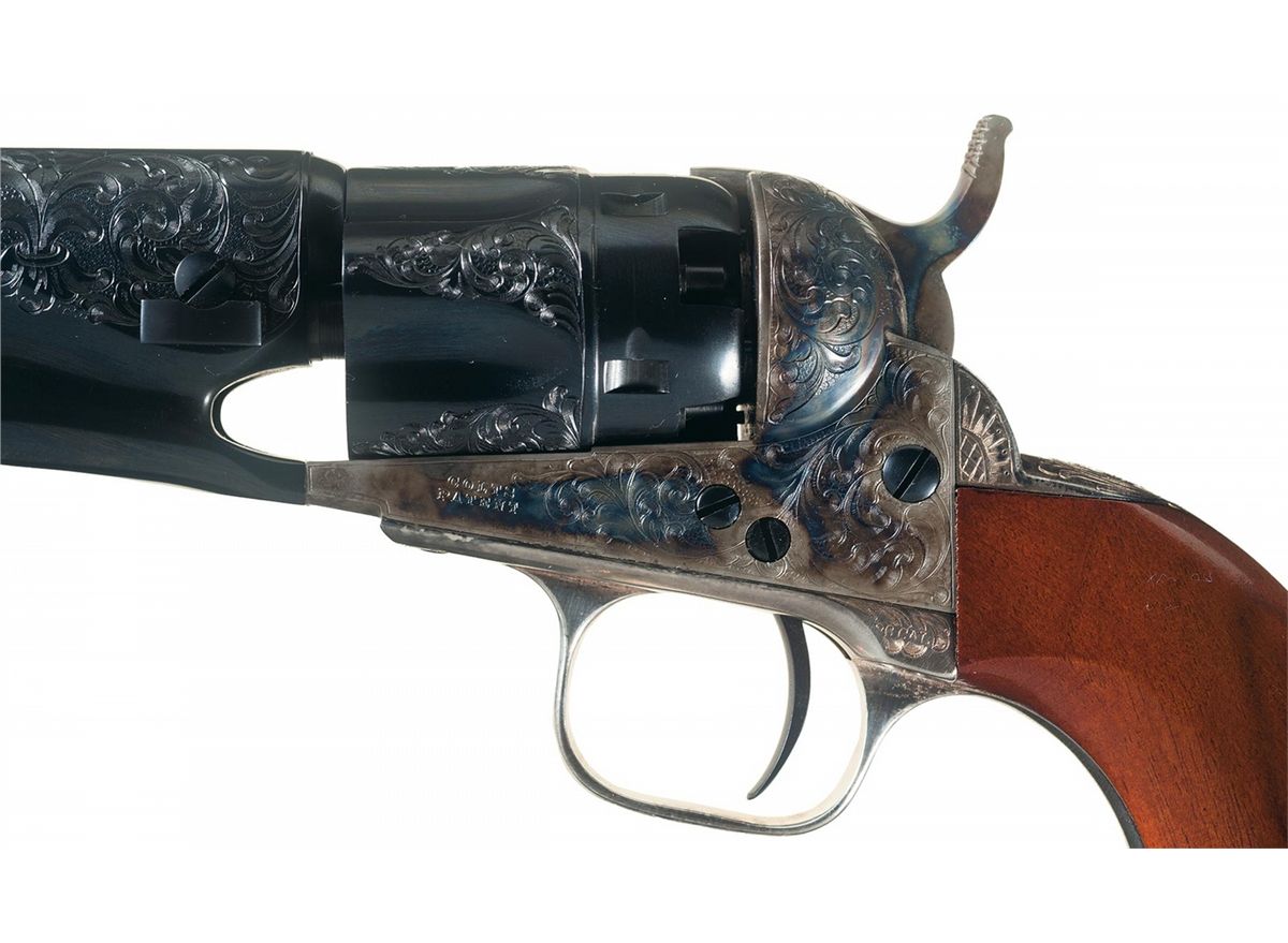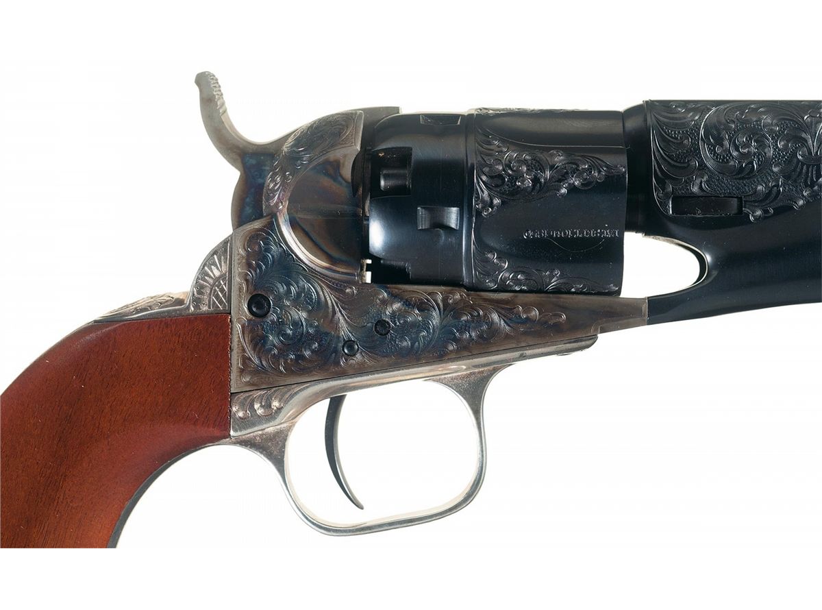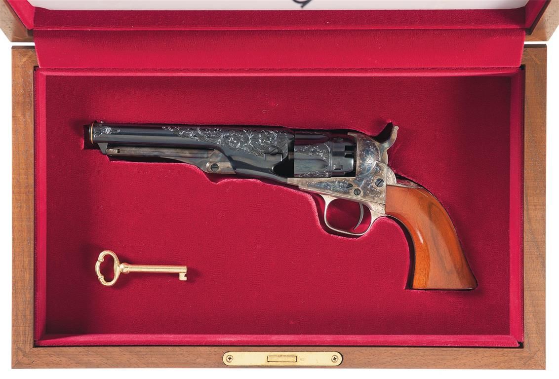 This revolver has beautifully executed floral scroll engraving at the muzzle, the rear half of the barrel, the cylinder, the frame, the trigger guard bow and the top of the back strap. There is a gold band inlaid at the muzzle. With a Colt Custom Shop walnut case lined in wine colored velvet and a copy of the display sheet.