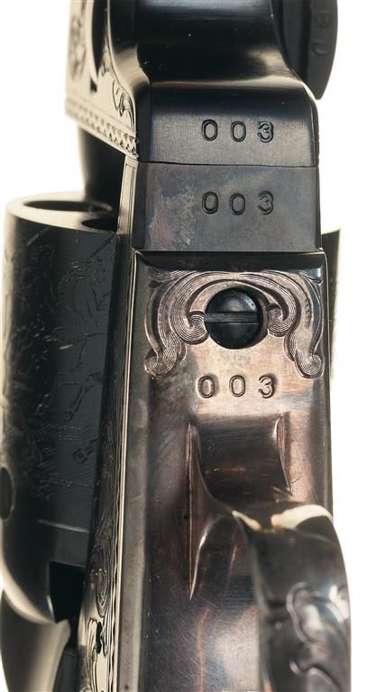 This revolver has beautiful factory floral scroll engraving on the rear section of the barrel, on the frame, on the trigger guard and at the top of the back strap along with a gold inlaid band at the muzzle. With a Colt Custom Shop factory walnut case lined in royal blue velvet and a copy of the display sheet.