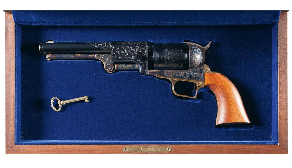 This example has beautifully executed floral scroll engraving on the rear section of the barrel, the sides of the loading lever, the frame, the trigger guard and the top of the back strap along with a gold inlaid band at the muzzle. With a walnut Colt Custom Shop case lined in royal blue velvet. With a copy of the display sheet.