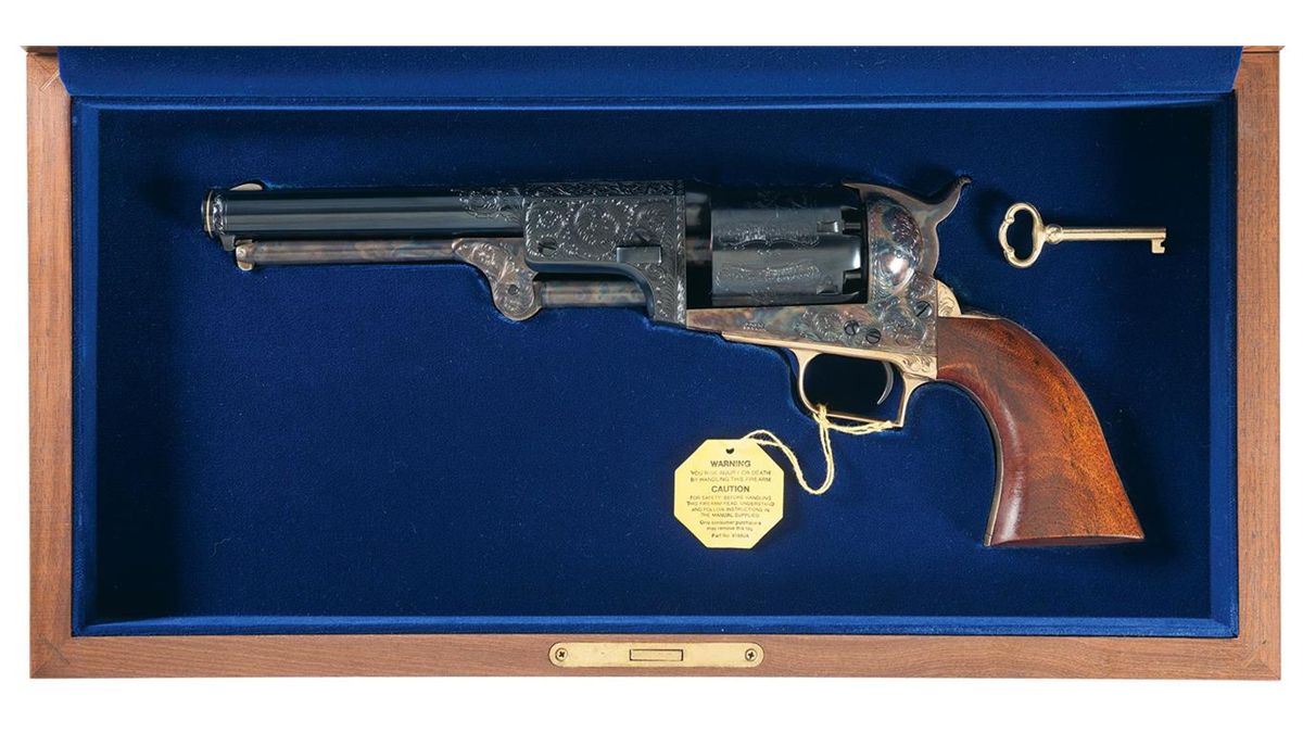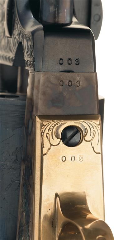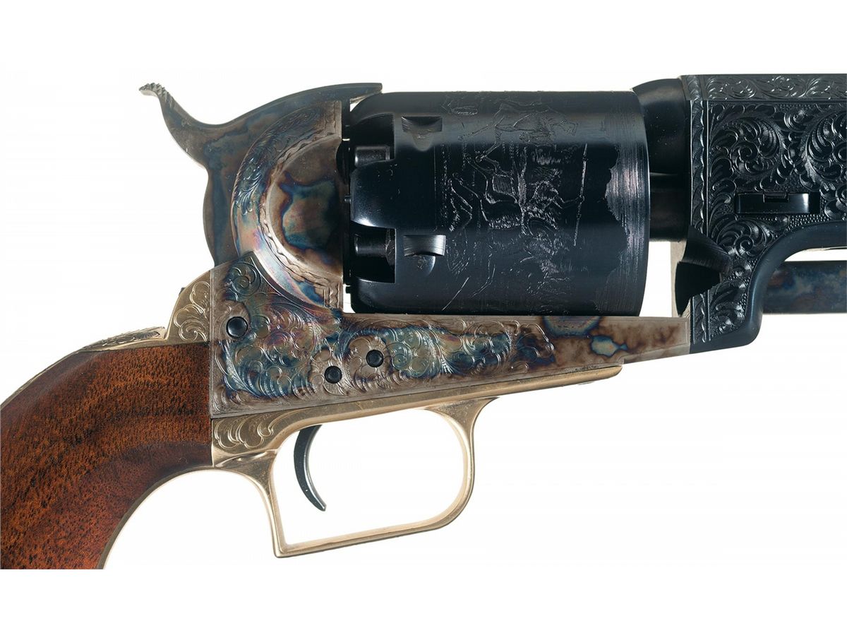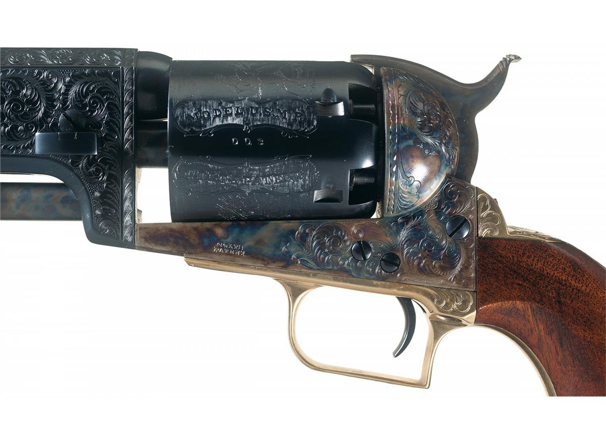 This example has beautifully executed floral scroll engraving on the sides of the loading lever, rear section of the barrel, barrel lug, frame, trigger guard bow, and the top of the back strap. With a Colt Custom Shop walnut case lined in royal blue velvet and a copy of the display sheet.