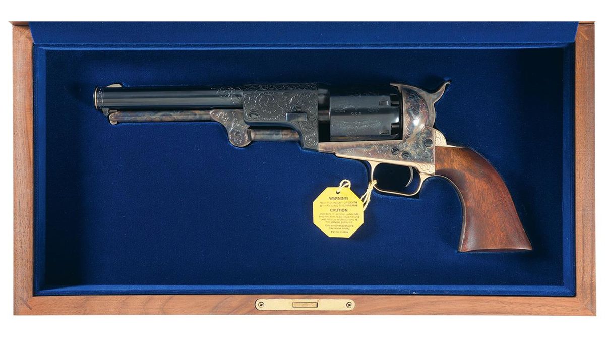 This example has beautiful floral scroll engraving on the sides of the loading lever, the rear half of the barrel, the sides of the frame, the trigger guard bow and the top of the back strap. There is a gold inlaid band at the muzzle. With a Colt Custom Shop walnut case lined in royal blue velvet and a Colt "woodgrain" box numbered to another gun. With a copy of the display sheet.