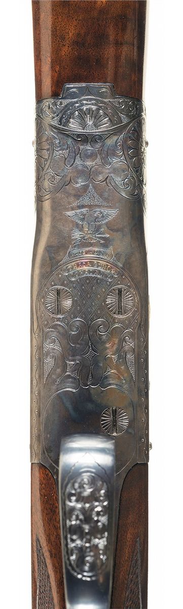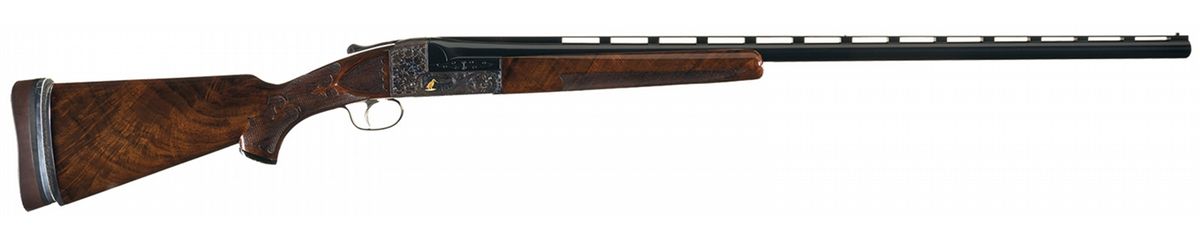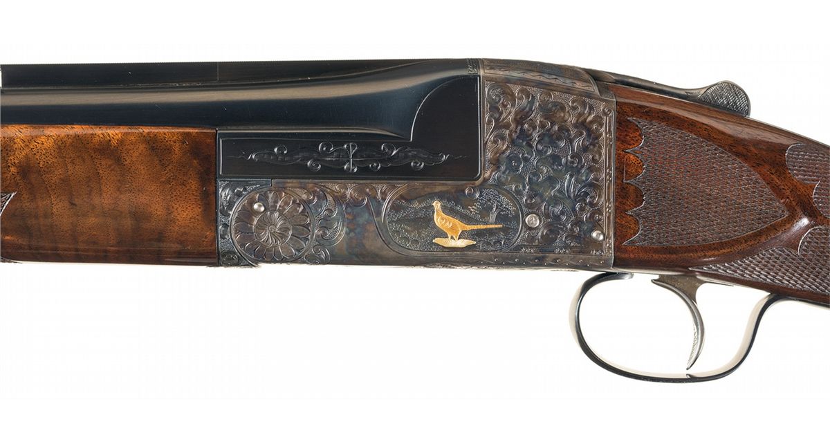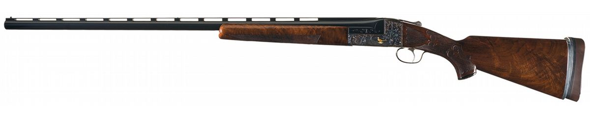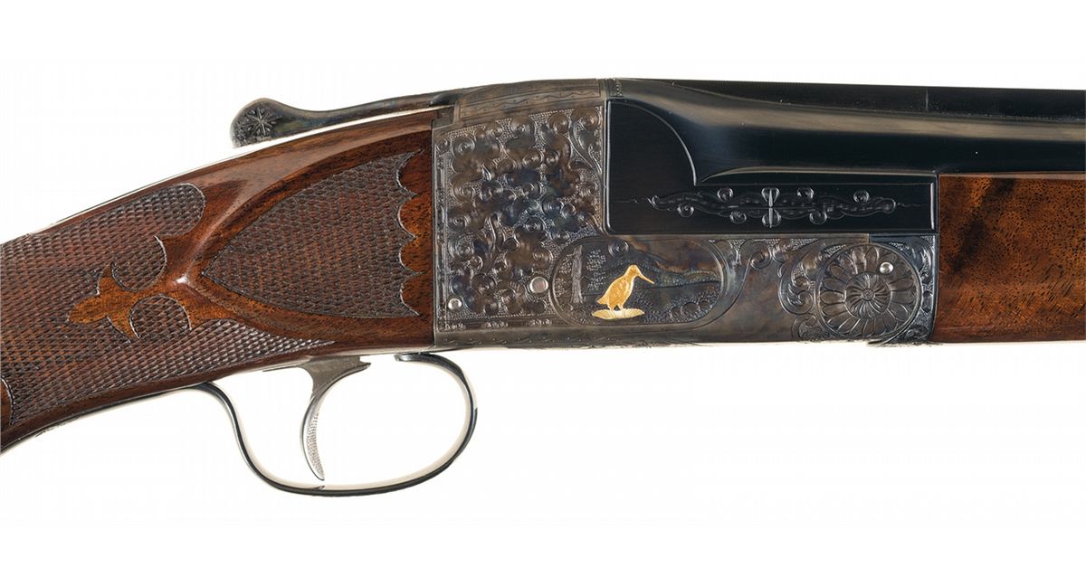 Manufactured in 1972. This example has masterfully executed floral scroll engraving with a gold inlaid game scene on each side of the receiver. The left side shows a gold inlaid pheasant in a field scene and the right side shows a gold inlaid woodcock in a field scene. During this time period Bill Mains was the factory engraver. There is a small signature on the right side of the receiver on one of the scrolls that looks like "BE". The bottom of the receiver is engraved with an eagle clutching three arrows. The barrel has two white bead sights, is choked .030 and has a 2 3/4 inch chamber with an ejector. Mounted on a nicely figured, multi-point checkered beavertail walnut forearm and pistol grip stock with plastic grip cap, blank initial oval and a Kick-Eez recoil pad on an aluminum pad adjuster. Length of pull is 14 1/4 inches.