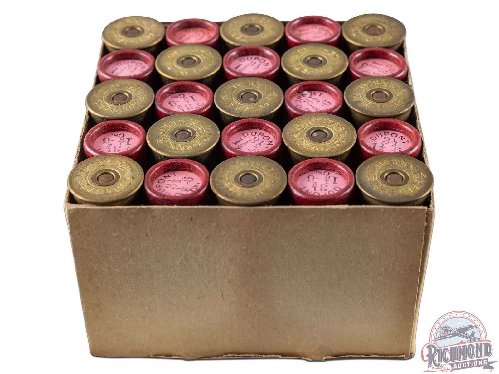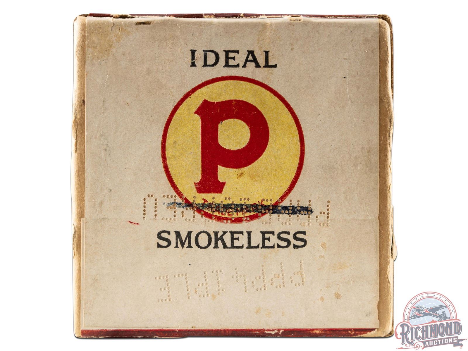 Listed as a "6" rarity in Bacyk's Shotshell Encyclopedia. Box is a 25 round, 12 gauge, two-piece cardboard "Ideal" labeled shotshell box with Cincinnati, Ohio Address. Box is full of correct shells with seal broken and shells loaded with correct "Dupont" Smokeless powder and "6 CH" shot.