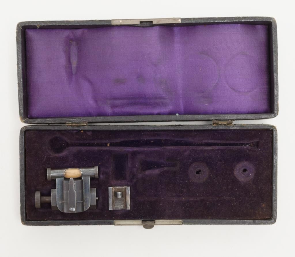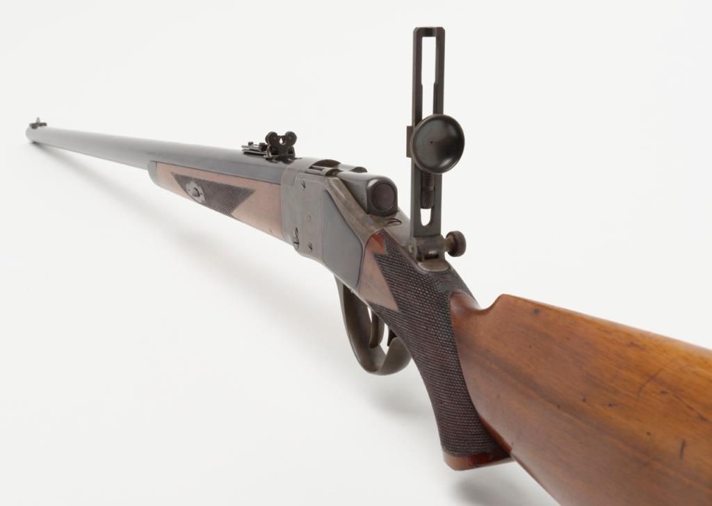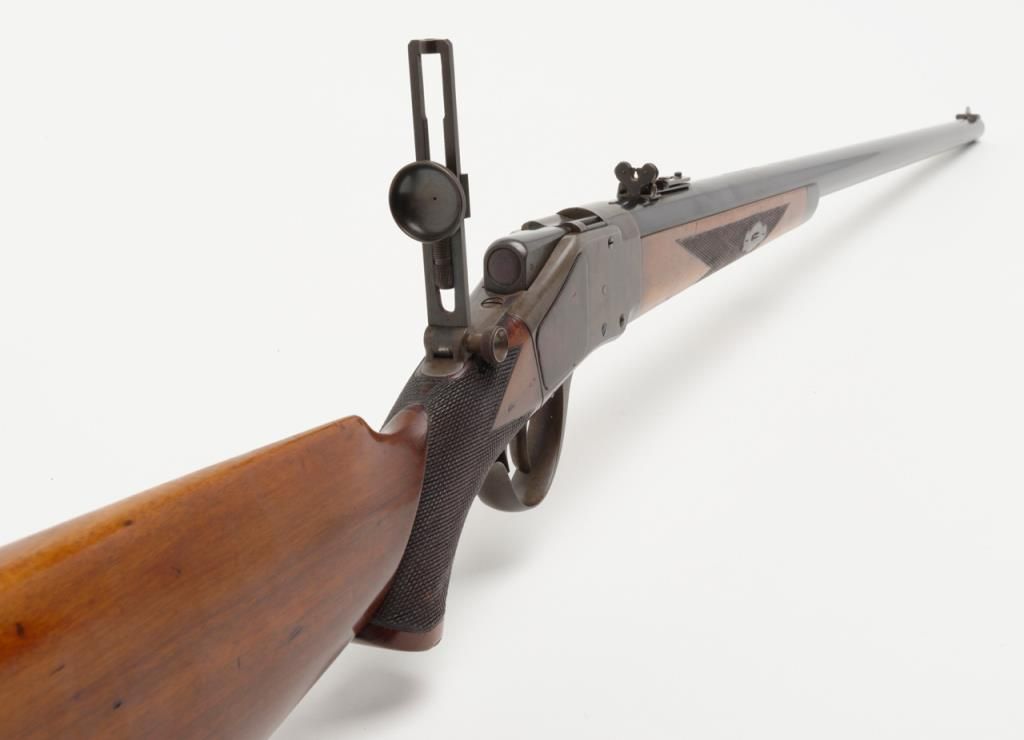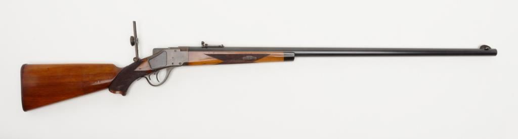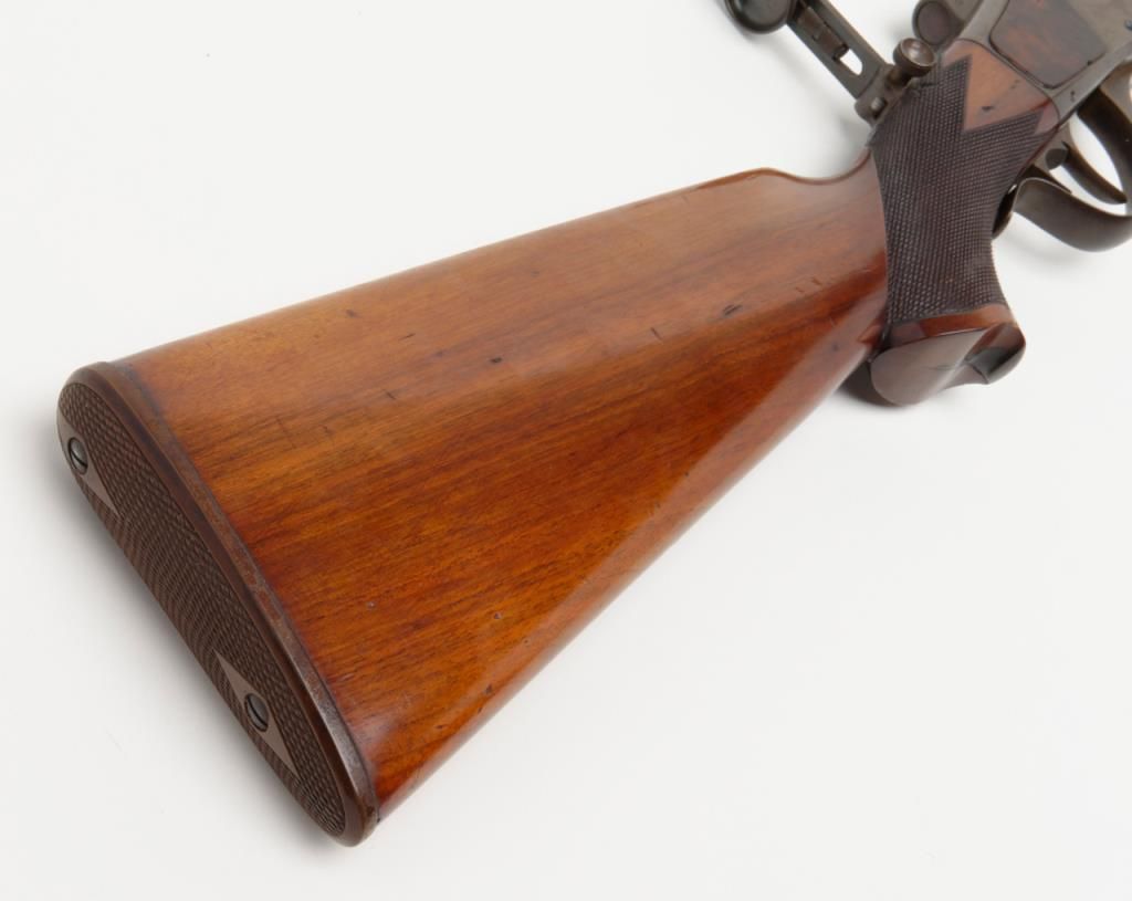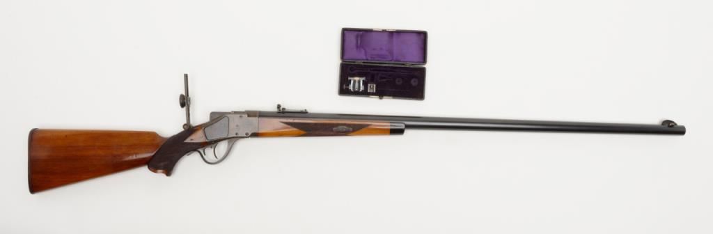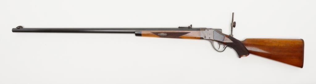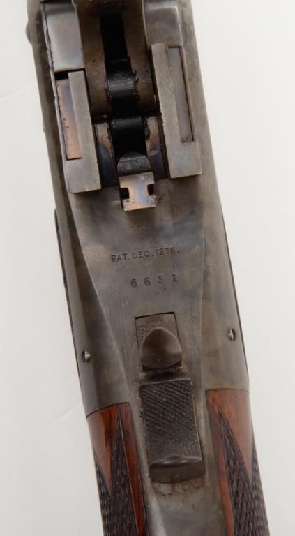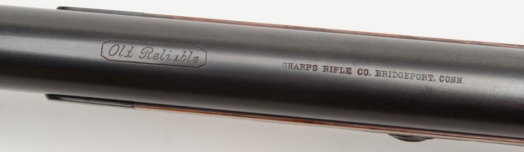 Factory Special Order Sharps Model 1878 Long Range rifle, .45-120 3-1/4” case, with factory target sight, Freund-marked More light rear hunting sight, with Freund-marked large blade front sight, blue and case hardened finish, checkered woodstocks, #6651. Factory letter states that this rifle was ordered on May 25, 1878 by E.S. Harris, with special sights and fitting which describes the aforementioned sights. This rifle was owned by a prominent New York City merchant who used it on hunting trips to Colorado and Montana in the 1870’s-1880’s and was acquired by our consignor from the descendants in 1971. Rifle remains in fine to excellent original condition showing 98%-99%+ original bright blue on the barrel withjust slight beginning natural age; frame shows 95%-98% case hardening slightly drifting and toning a very small amount, checkered wood stocks are also fine to near excellent with minor storage and use marks, light handling and minor use, butgenerally near excellent overall; markings are sharp, edges are crisp, bore is fine to excellent. Rifle is fitted with its orginal factory ordered Freund sight in the barrel dovetail and shows its Long Range tang sight. An original Sharps sight