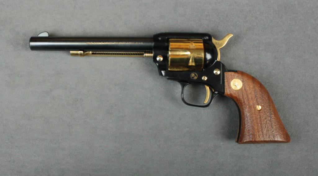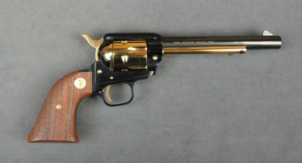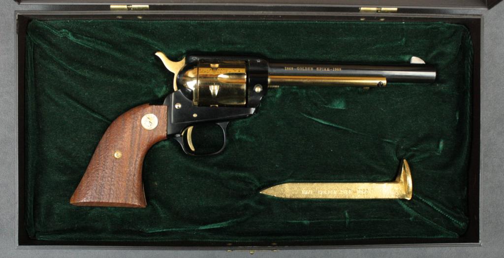 Factory cased Colt Frontier Scout SAA  revolver, .22LR cal., 6” barrel, blue and  gold wash finish, smooth plastic wood grained  medallion grips, #8208GS. This gun is in  overall excellent condition showing 99%+original finish, fine bore, action and  markings, fine grips. Issued in 1969, there  were 11,000 units produced; plastic relief  wood grained case in excellent condition with  gold colored railroad spike included.  Est.:  $300-$500.