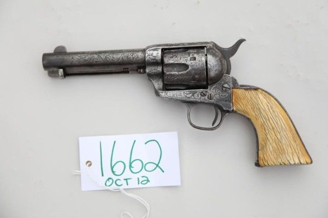 Factory engraved Colt SAA revolver, .45 cal., 4-3/4” barrel, nickel finish, period ivory grips, #108247. This gun is in overall good condition showing traces of nickel finish in protected areas, scattered light to moderatepitting with the moderate pitting mostly on the cylinder and muzzle of barrel; dark patina overall with engraved ejector rod housing showing an old cleaning; good action and bore, beautifully worn and age crackedivory grips with scattered old small losses at toes and along edges; accompanied by a 1977 dated factory letter confirming features and factory engraving with “stocks not listed”; shipped to Simmons Hardware Co. ,St. Louis, MO. on March 28, 1884, 5 guns in shipment. A real factory engraved black powder SAA with lots of character! Est.: $3,000-$6,000.