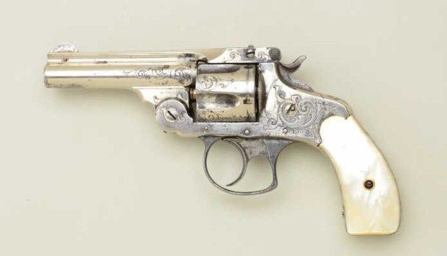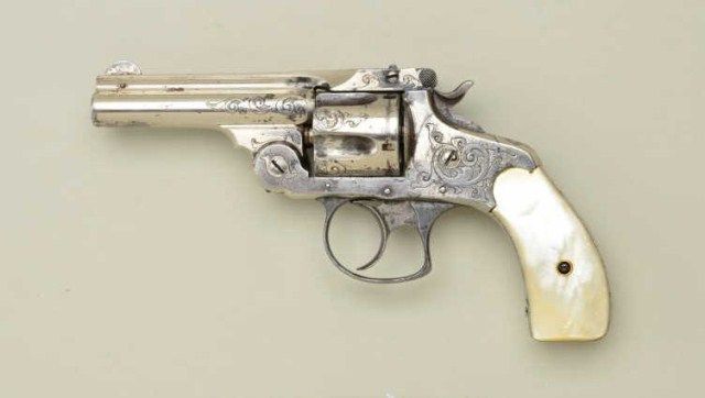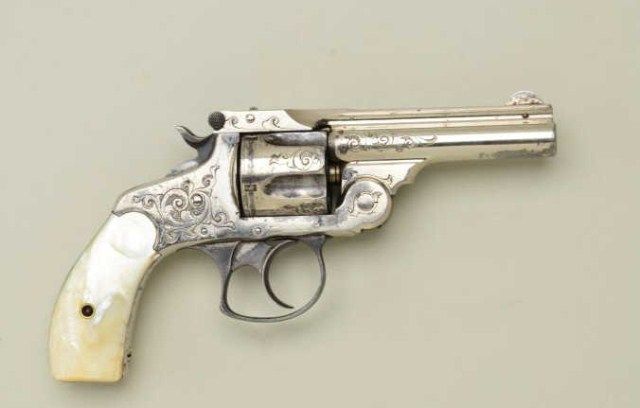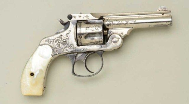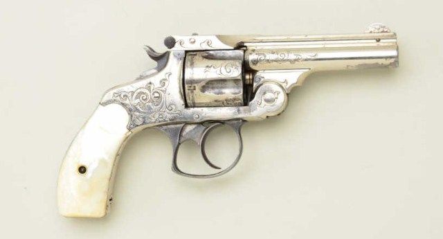 Factory engraved Smith & Wesson top break DA revolver, .38 cal., 3-1/4” barrel, nickel finish, pearl grips, #174476. This gun is in overall very good to fine condition showing approx. 70% original nickel with somescattered flaking; very good bore, crisp action and markings, iridescent colors to very good pearl grips that fit this gun nicely. Est.: $600-$1,200.