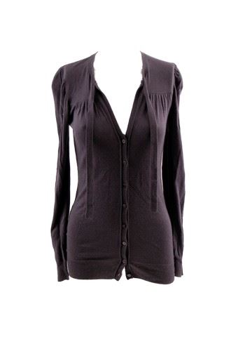 Avigal (Vanessa Paradis) screen worn, hero, purple long sleeve button front with ties at the neck cardigan sweater.