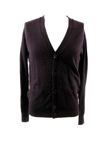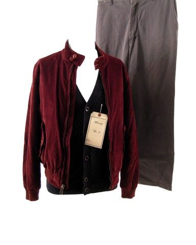Murray screen worn, hero, dark wine corduroy golf style zipper front with button at the neck 'Brooks Brothers' coat, navy v-neck with dots on the front 'Paul Smith' sweater, (size S) and faded grey twill flat front pants. Includes wardrobe tag!