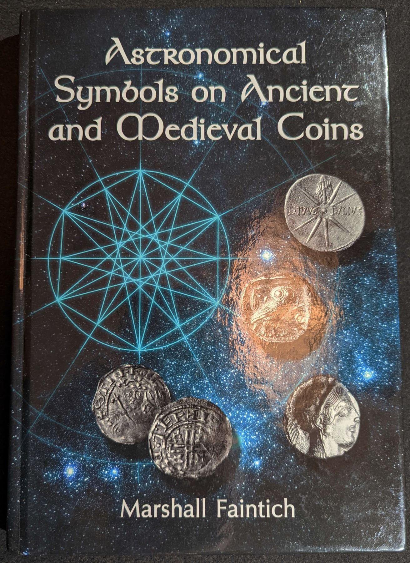 Faintich, Marshall. ASTRONOMICAL SYMBOLS ON ANCIENT AND MEDIEVAL COINS. McFarland & Company, Inc. 2008. 8vo. vi, 225, (3) pages. Jefferson. original pictorial boards. b&w line illustrations. maps. charts. Fine. This book presents the hypothesis that astronomical symbols on ancient and medieval coins were often used as a way to record actual celestial events. The author provides more than 550 figures and line drawings of coins, maps, and astronomical events to illustrate this hypothesis. In addition, appendices present information on the accuracy of the data supporting the analysis as well as offer additional examples. Lot weight: 1 lbs 5oz. Subject(s): Ancient, European Coinage.