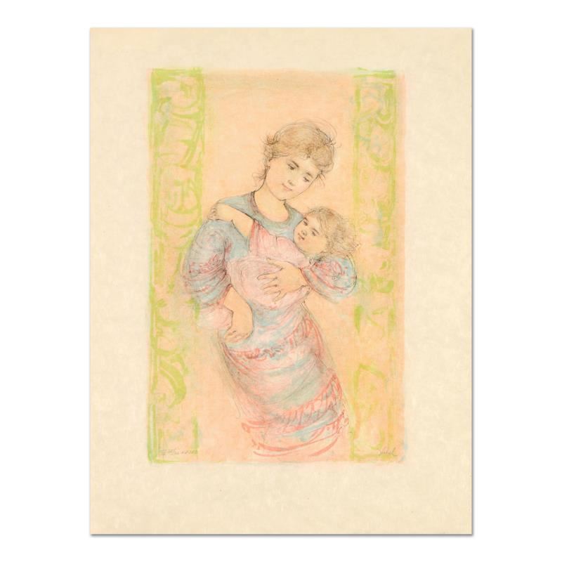"Fair Alice and Baby" is a limited edition lithograph on rice paper by Edna Hibel (1917-2014), numbered and hand signed by the artist. Includes Certificate of Authenticity. Measures approx. 20" x 26" (border), 13" x 20" (image).