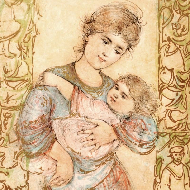 "Fair Alice and Baby" is a limited edition lithograph on rice paper, numbered and hand signed by Edna Hibel (1917-2014). Includes Certificate of Authenticity! Measures approx. 20" x 26.5" (with border), 13" x 21" (image).