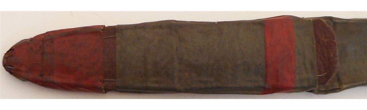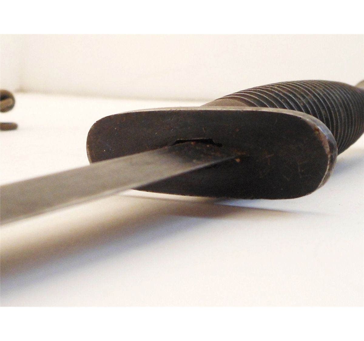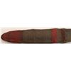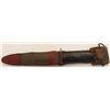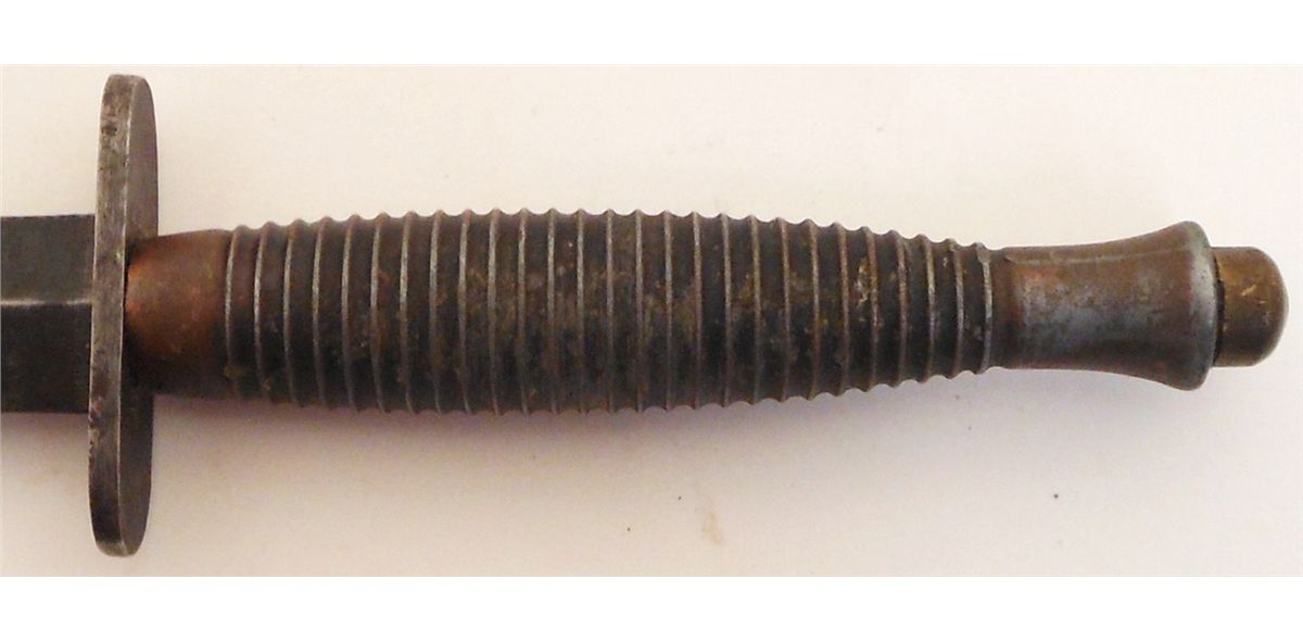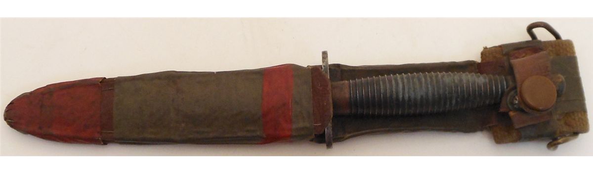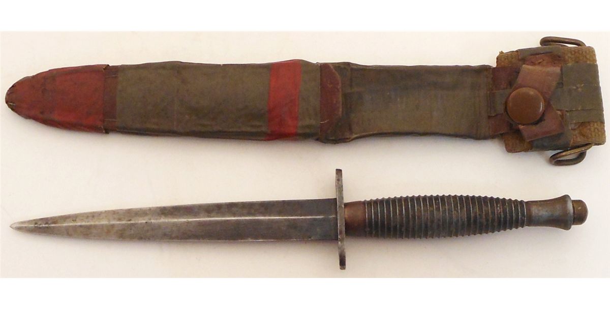 11 1/4" total length with a 6 1/4" blade, F-S Fighting knife was issued to British Commandos. This knife was used by a US Soldier and as told by the consignor, his relative, took many lives in hand to hand combat. The scabbard is mostly covered with USGI Green tape, snap is almost separated from its leather strap.