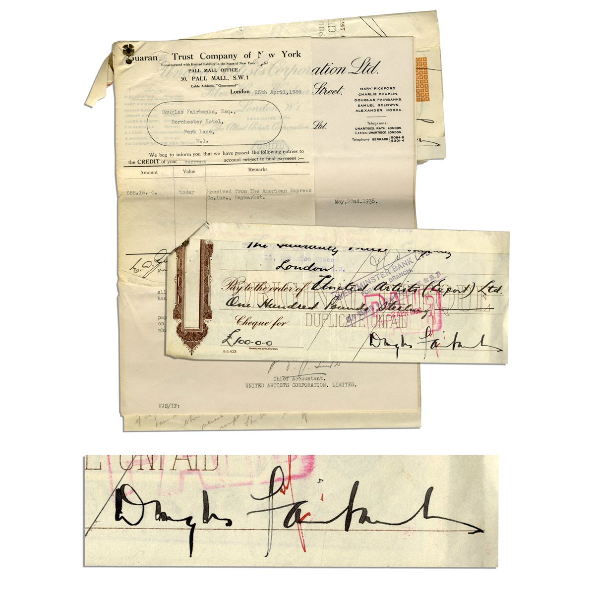 Lot of sixty checks signed by Douglas Fairbanks, Sr. dated 9 March to 23 April 1936. The 6.5'' x 2.5'' checks, drawn on the London branch of the Guaranty Trust Company of New York, are in English currency. Checks are collated to a metal brad along with seven letters and receipts of various sizes relating to American Express ''travellers cheques''. Overall very good. Two 9.5'' x 12.5'' ledger sheets reflect debit of each check to Fairbanks' account. Moderate paper loss and edge wear, else very good condition.