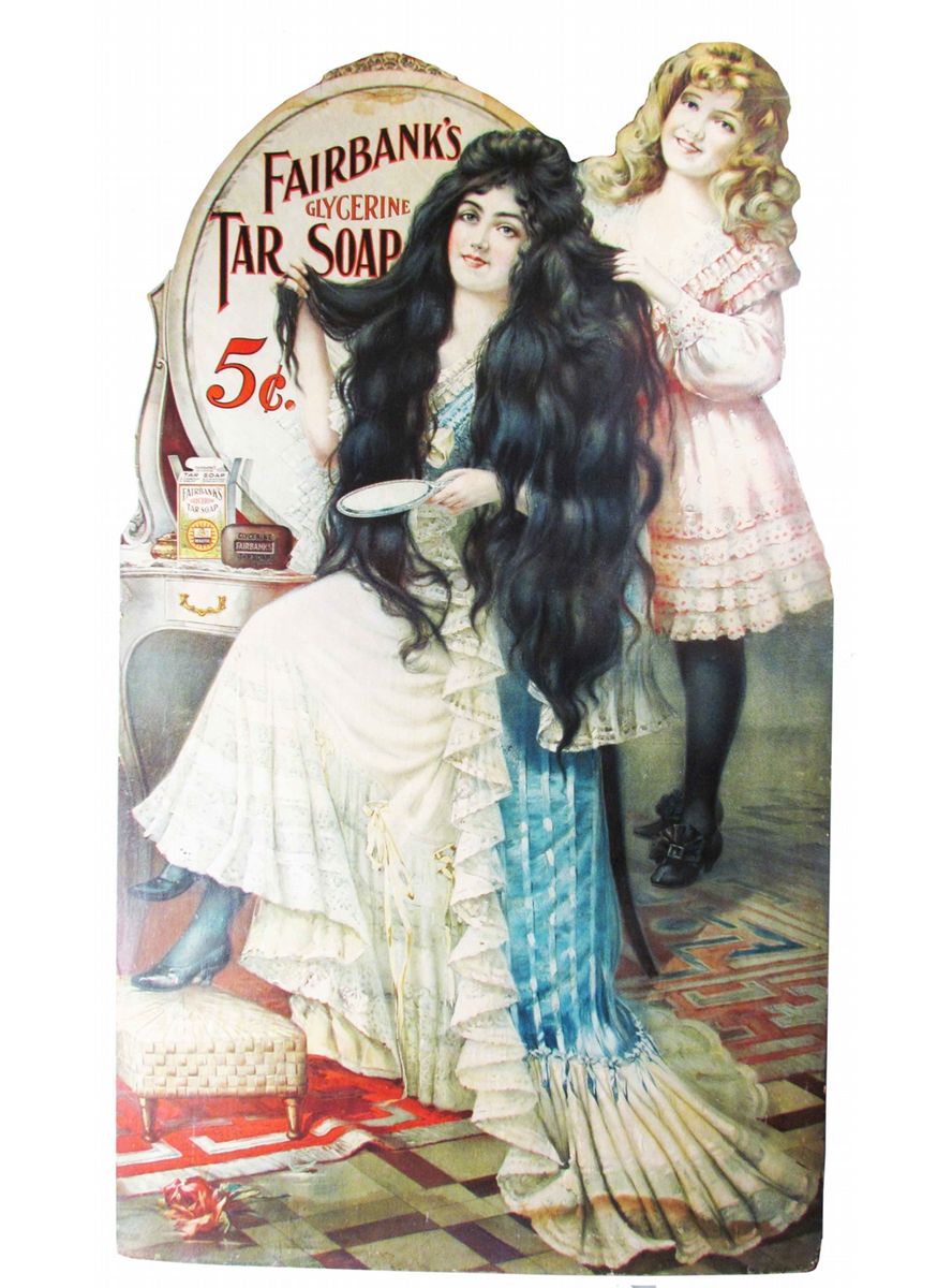 Fairbanks Tar Soap Die Cut Cardboard Window Display. Dated Beautiful color and graphics. Some restoration at top and bottom of skirt otherwise very good condition. 35 X 59 inches.