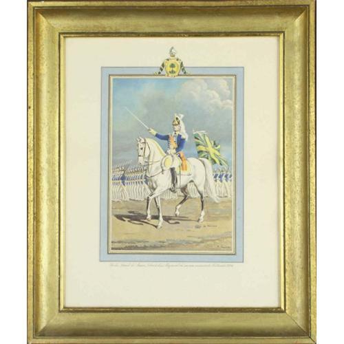 This is a 15.5? x 12.5? print of a watercolor portrait of Colonel Charles Daniel an 18th century Dutch colonel of the de Meuron regiment. He is flying the flag that is typical of the classic Swiss flame that was flown by those in the service of France. Tightly rendered and showing great detail, this picture is in very good condition. Framed beautifully in a gold wood frame that is in good condition and is lined with a slim black trim that enhances the picture and reflects the colors of the border on the picture. The entire piece measures 19.5? x 16.5? including the frame. Along the bottom of the print are the words ?Charles Daniel de Meuron, Colonel d?un Regiment de son nom au service de Hollande 1784?