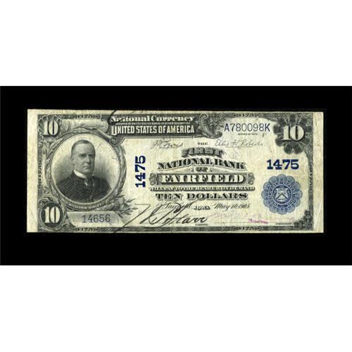 <B>Fairfield, IA</B></I> - $10 1902 Plain Back Fr. 624 <B>The First NB</B></I> Ch. # 1475<BR> The penned signed cashier's signature of W.P. Starr is bold while the purple stamped signature of the vice president has faded some. Still an attractive note. <B>Fine.</B></I><BR><BR><b>Shipping:</b> Coins & Currency (<a target="_blank" href="http://www.heritageauctions.com/common/shipping.php">view shipping information</a>)