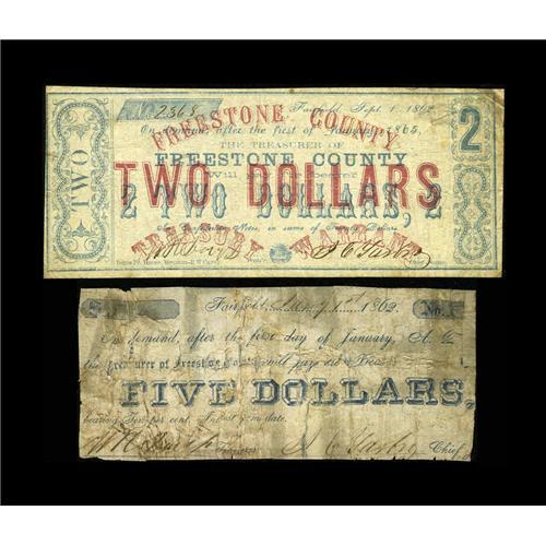 <B>Fairfield, TX- Freestone County</B></I> $2, $5 Sept. 1, 1862, Jan. 1, 1862 Medlar 2, 4<BR>Two pieces, the $2 a nice <B>Fine-Very Fine,</B></I> the $5 a much repaired <B>Fair.</B></I><BR><I>From The William A. "Bill" Bond Collection</B></I><BR><BR><b>Shipping:</b> Coin/Currency (<a target="_blank" href="http://www.heritageauctions.com/common/shipping.php">view shipping information</a>)