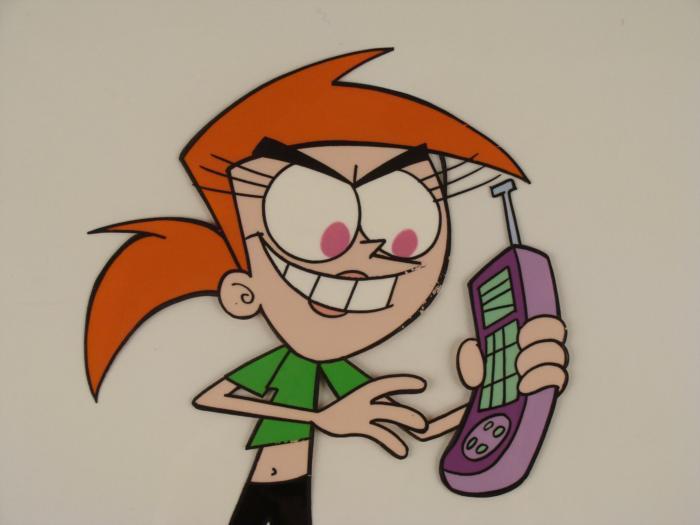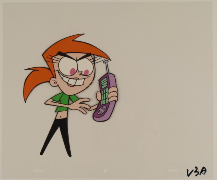 This original animation cel is from the Nickelodeon TV show Fairly Odd Parents. Timmy Turner is a short, buck-toothed 10-year-old boy with a pink cap who lives in Dimmsdale, a small suburban town with his dim-witted parents. His life is constantly miserable, due to the fact that his parents are rarely home and he is babysat by an incredibly evil teenager, Vicky, and that, generally, no one understands him (as indicated by the show's theme song). But everything changes when he receives two fairy parents: Cosmo and his wife, Wanda and later, their son Poof. Timmy learns that his fairy godparents are capable of granting him any wish he wants within certain limits. However, Timmy's immature nature causes him to sometimes ask for wishes that unintentionally result in disaster, and he and his fairy parents and fairy brother must find a way to "unwish" the wish. Here it looks like Vicky has been possessed. · Original Production Animated Cel · Overall Size of Cel: 10 1/2" x 12 1/2" · Excellent Condition This is an original hand-painted cel set-up used in the production of an episode of "Fairly Odd Parents." Each one-of-a-kind set-up represents a slight change in position of the characters. When individually photographed and projected in rapid succession, the images appear to move.To create production cels, the original animator's drawing is transferred onto an acetate cel (by hand-inking and/or photo copying). The cel is then hand-painted on the reverse side. The cel is ready to be matted and framed. The animator's notations are at the bottom of the cel. Some of the paint to Vicky's outline is fading.
