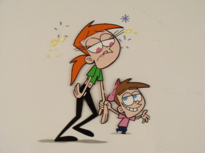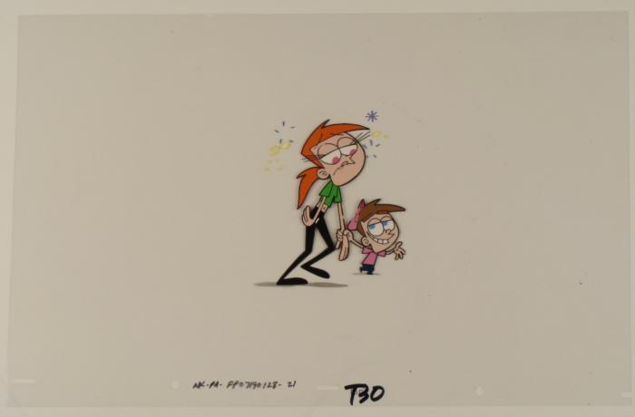 This original animation cel is from the Nickelodeon TV show Fairly Odd Parents. Timmy Turner is a short, buck-toothed 10-year-old boy with a pink cap who lives in Dimmsdale, a small suburban town with his dim-witted parents. His life is constantly miserable, due to the fact that his parents are rarely home and he is babysat by an incredibly evil teenager, Vicky, and that, generally, no one understands him (as indicated by the show's theme song). But everything changes when he receives two fairy parents: Cosmo and his wife, Wanda and later, their son Poof. Timmy learns that his fairy godparents are capable of granting him any wish he wants within certain limits. However, Timmy's immature nature causes him to sometimes ask for wishes that unintentionally result in disaster, and he and his fairy parents and fairy brother must find a way to "unwish" the wish. Timmy seems to be dragging a careless Vicky somewhere. Original Production Animated Cel Overall Size of Cel: 10 1/2" x 16 1/2" Excellent ConditionThis is an original hand-painted cel set-up used in the production of an episode of "Fairly Odd Parents." Each one-of-a-kind set-up represents a slight change in position of the characters. When individually photographed and projected in rapid succession, the images appear to move.