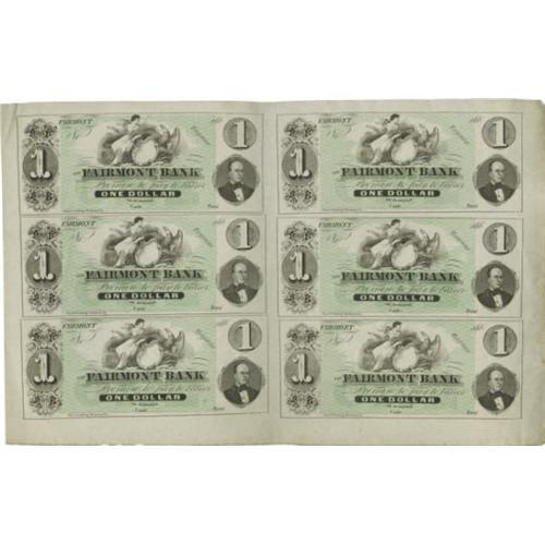 <B>Fairmont, VA- The Fairmont Bank</B></I> $1-$1-$1-$1-$1-$1 186_ G14a-G14-G14a-G14a-G14a-G14a Jones BF0505-BF0505-BF0505-BF0505-BF0505-BF0505 Uncut Sheet<BR> Sheets are just plain rare on this bank as this is the first one we have handled. <B>Crisp Uncirculated</B></I>.<BR><BR><b>Shipping:</b> Coins & Currency (<a target="_blank" href="http://www.heritageauctions.com/common/shipping.php">view shipping information</a>)