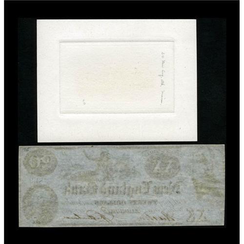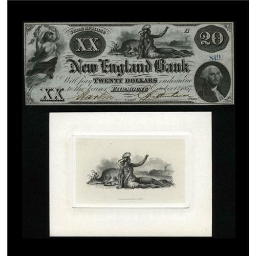 <B>Fairmount, ME - New England Bank</B></I> $20 Oct. 1, 1857 and Proof vignette<BR>This lovely note has serial 849, and is <B>About Uncirculated.</B></I> The Proof Vignette of the Native American and buck is mounted on card, and is <B>Uncirculated</B></I>.
