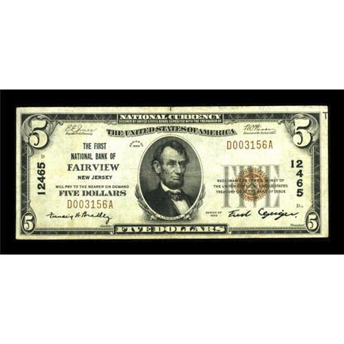 <B>Fairview, NJ</B></I> - $5 1929 Ty. 1 <B>The First NB</B></I> Ch. # 12465<BR> This was the only denomination issued from this Bergen County bank. <B>Fine+</B></I>.<BR><BR><b>Shipping:</b> Coins & Currency (<a target="_blank" href="http://www.heritageauctions.com/common/shipping.php">view shipping information</a>)