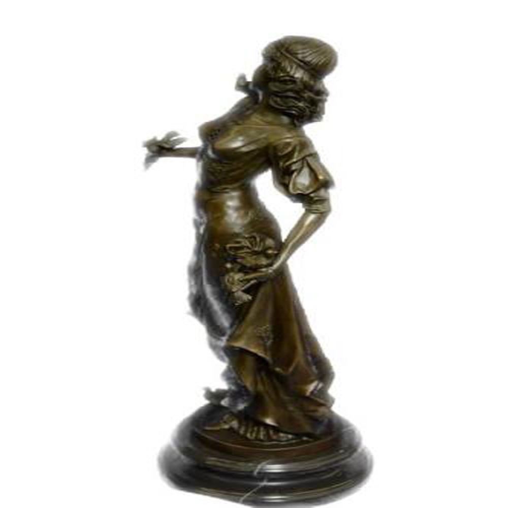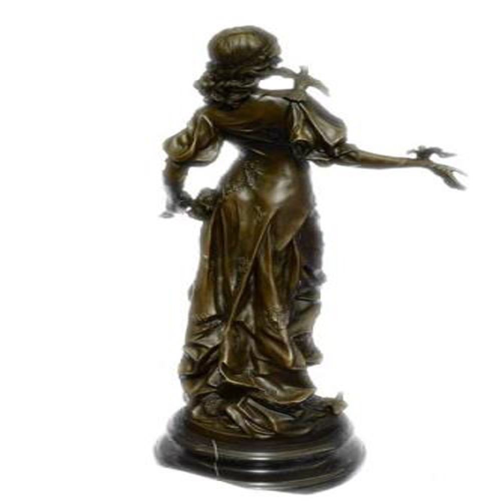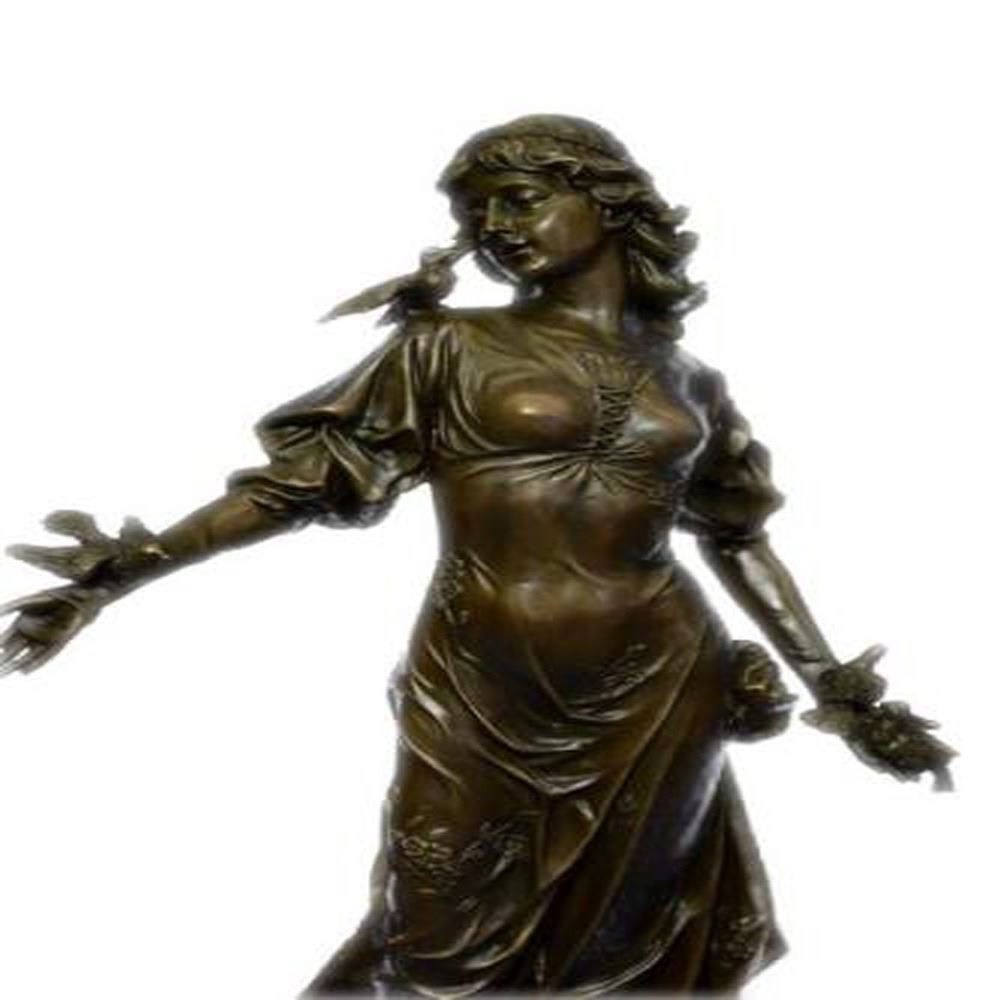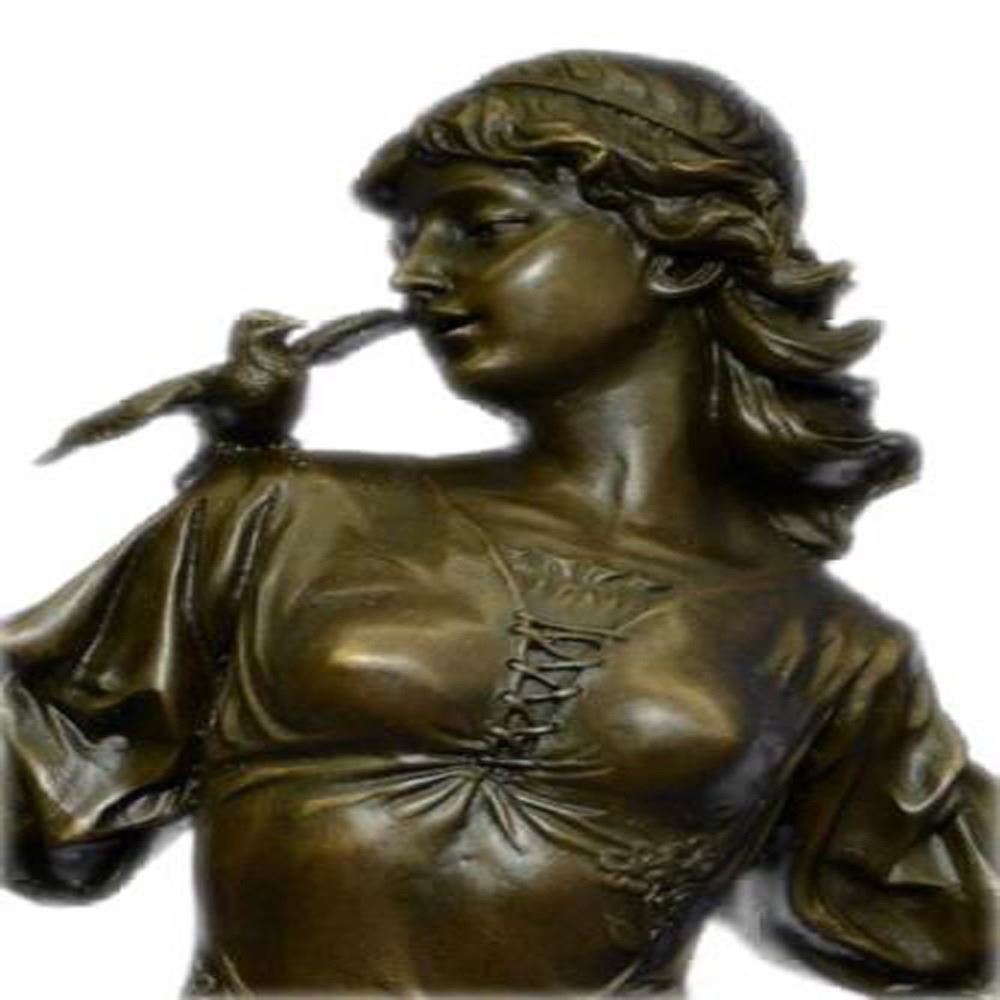 Superb bronze nude depicts a beautiful lady tenderly holding her bird. Shes beautifully sculptured from all angles of view. The detail and composition are excellent. The bronze is mounted on its marble base. Bronze Dimensions with Marble Base: Height 19 X Width 9 inches. Weight: 14 LBS.