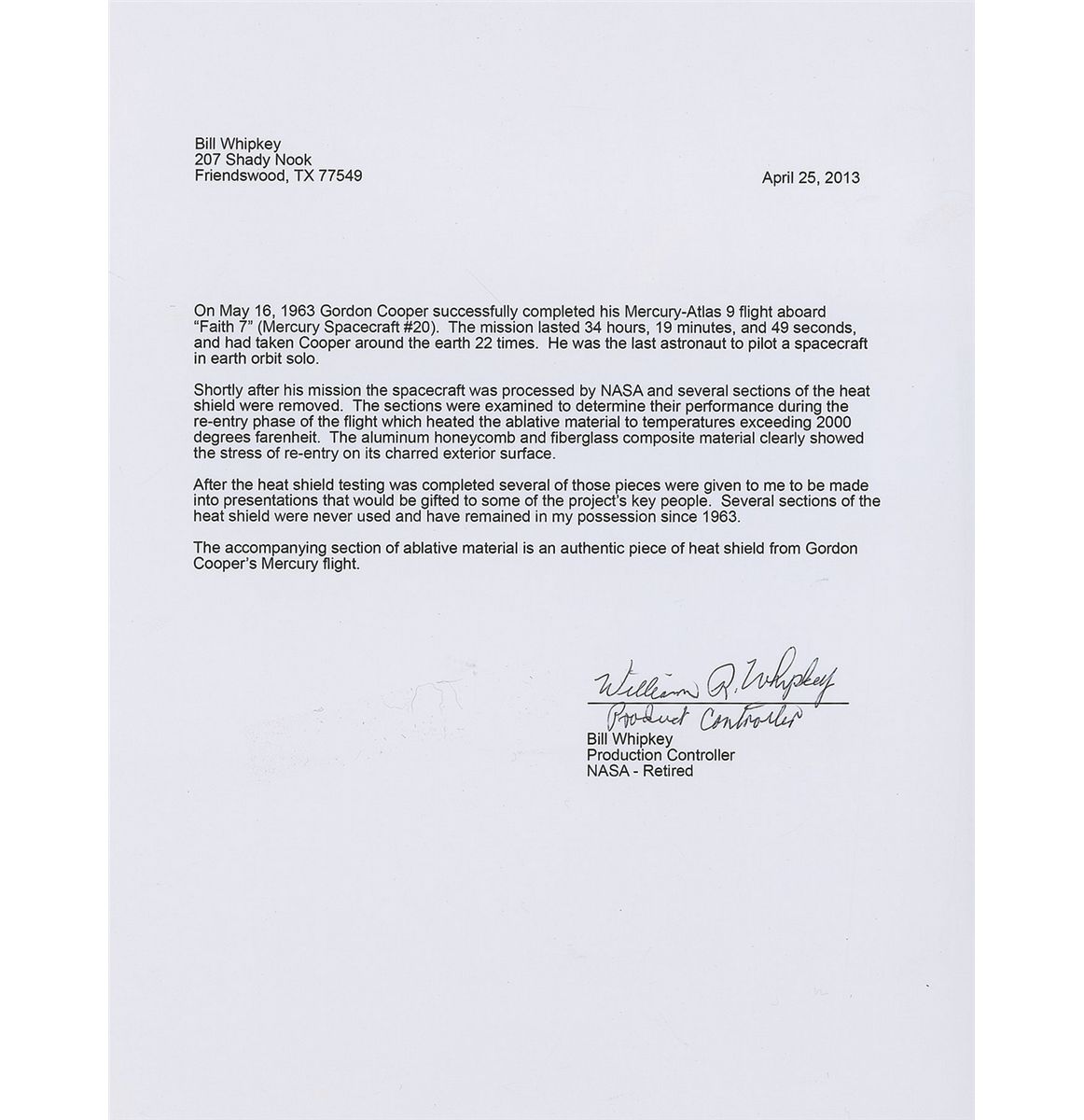 Substantial and well-documented segment from an outer perimeter section of heat shield from the Faith 7 capsule used for Gordon Cooper’s Mercury Atlas-9 flight, measuring approximately 2 x 2.25 x 1. Accompanied by a letter of authenticity from retired NASA production controller William R. Whipkey, in part: “Several sections of the heat shield were…examined to determine their performance during the re-entry phase of the flight which heated the ablative material to temperatures exceeding 2000 degrees fahrenheit. The aluminum honeycomb and fiberglass composite material clearly showed the stress of re-entry on its charred exterior surface. After the heat shield testing was completed several of those pieces were given to me to be made into presentations…Several sections of the heat shield were never used and have remained in my possession since 1963.” Additional documentation includes diagrams and schematics showing where this piece was located on the capsule.