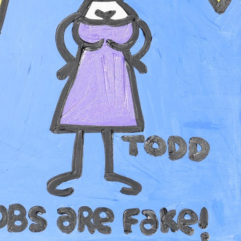 We acquired this piece as part of a larger collection. We do not approve of its inappropriate content. "Fake Boobs" is an original acrylic painting on gallery wrapped canvas by Todd Goldman, hand signed by the artist. Includes Letter of Authenticity. Measures approx. 48" x 36" (image). Due to the way this piece was stored there may be minor wear or signs of age (such as wear on the corners) but the piece is in overall good condition.