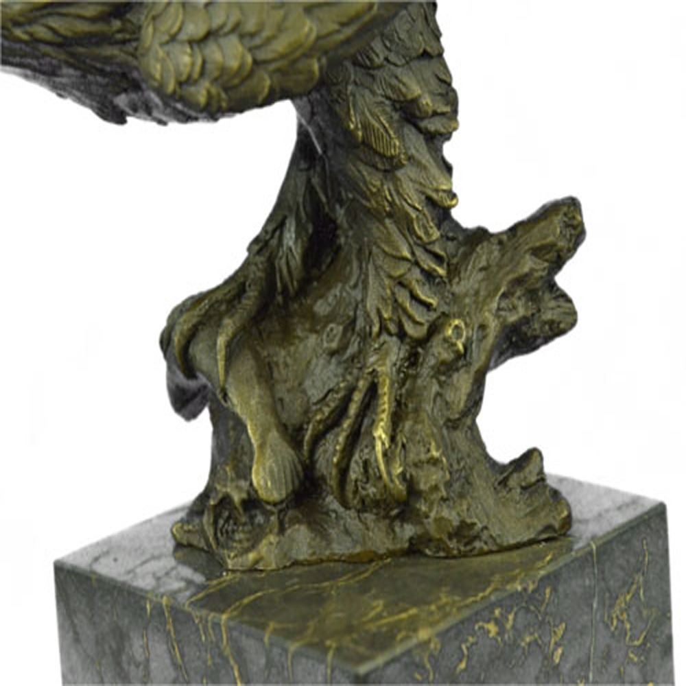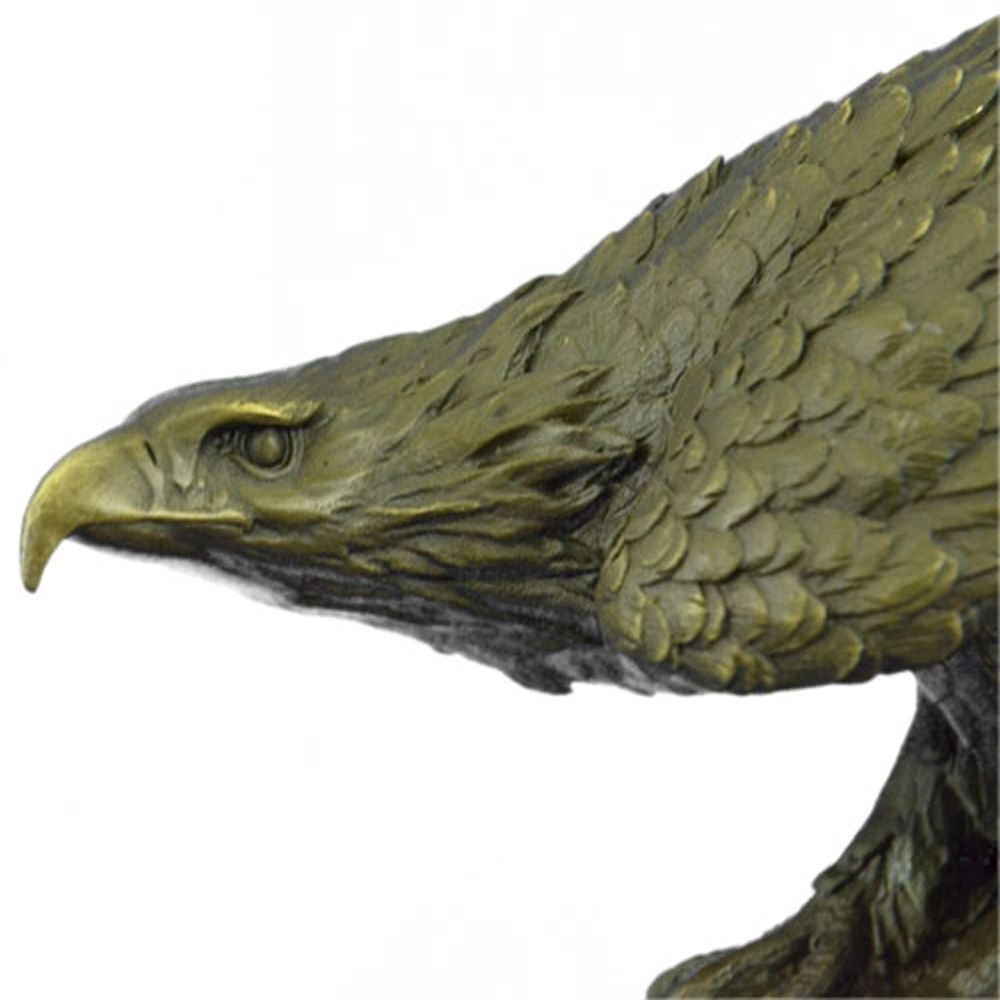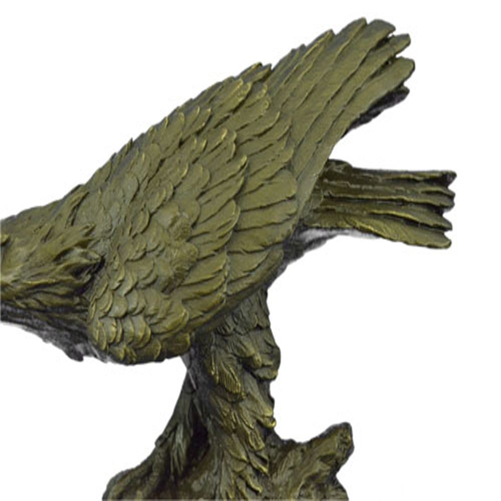 This eagle lets time pass by as he rests atop a nest, he watches carefully as his prey comes at close range. He sits peacefully and patiently as his claws are spread out giving him a perfect balance to fly off as soon as he see potential food. His feathers are even and all in the same shape of an oval, his beak has a pointy and sharp look to it. This is a 100% Bronze cast by using the age old method of lost wax casting and stained with a brown patina finish and it is mounted, along with its detailed Bronze plinth, upon a marble base. Bronze Dimensions with Marble Base: Height 10 X Width 8 inches. Weight: 10 LBS.