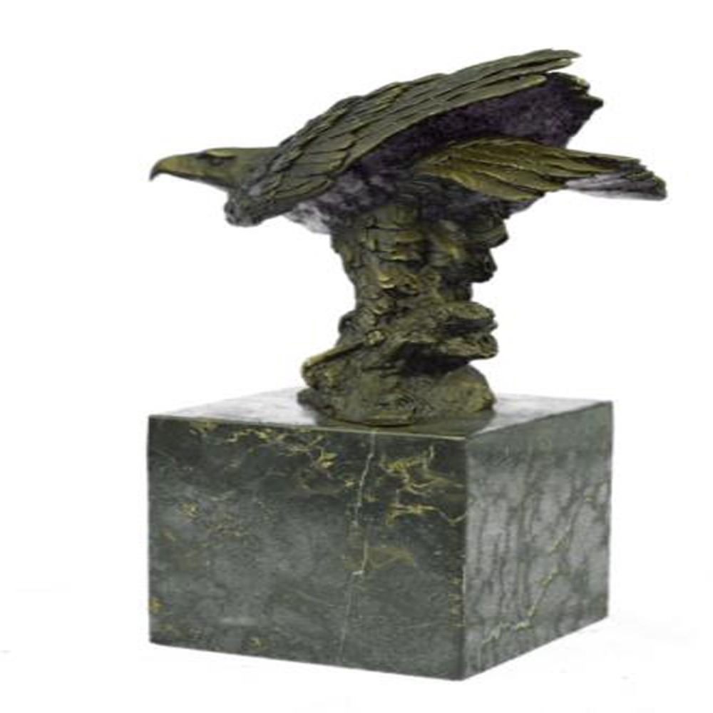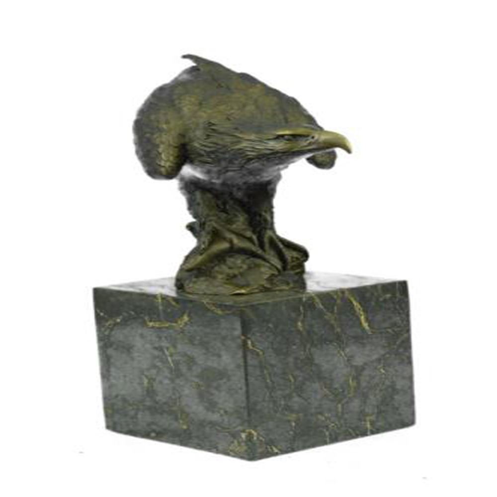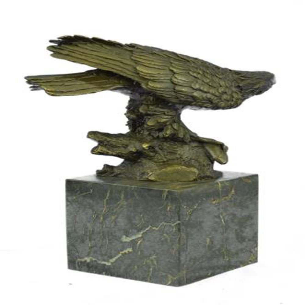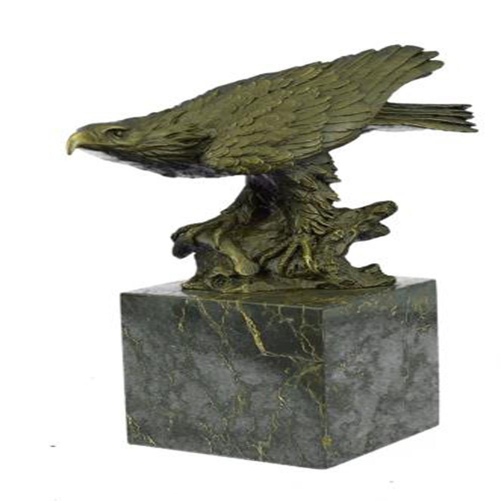 This eagle lets time pass by as he rests atop a nest, he watches carefully as his prey comes at close range. He sits peacefully and patiently as his claws are spread out giving him a perfect balance to fly off as soon as he see potential food. His feathers are even and all in the same shape of an oval, his beak has a pointy and sharp look to it. This is a 100% Bronze cast by using the age old method of lost wax casting and stained with a brown patina finish and it is mounted, along with its detailed Bronze plinth, upon a marble base. Bronze Dimensions with Marble Base: Height 10 X Width 8 inches. Weight: 10 LBS.