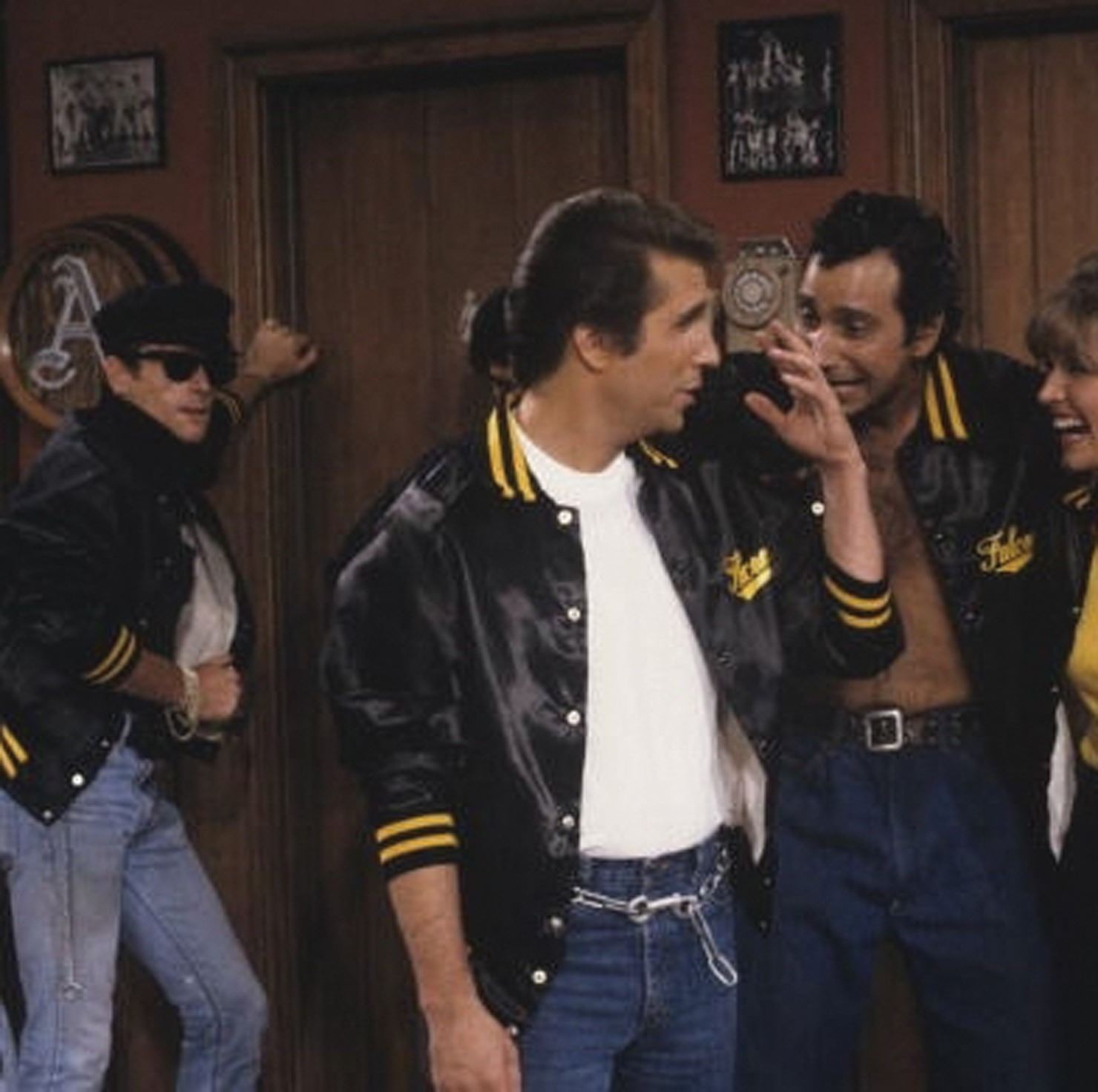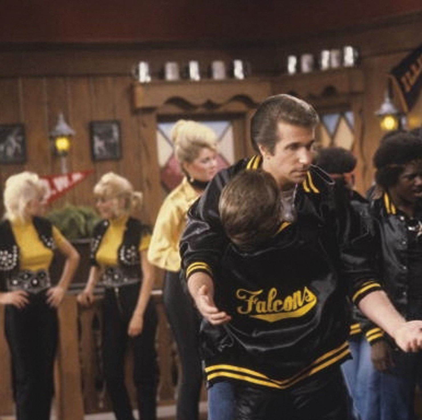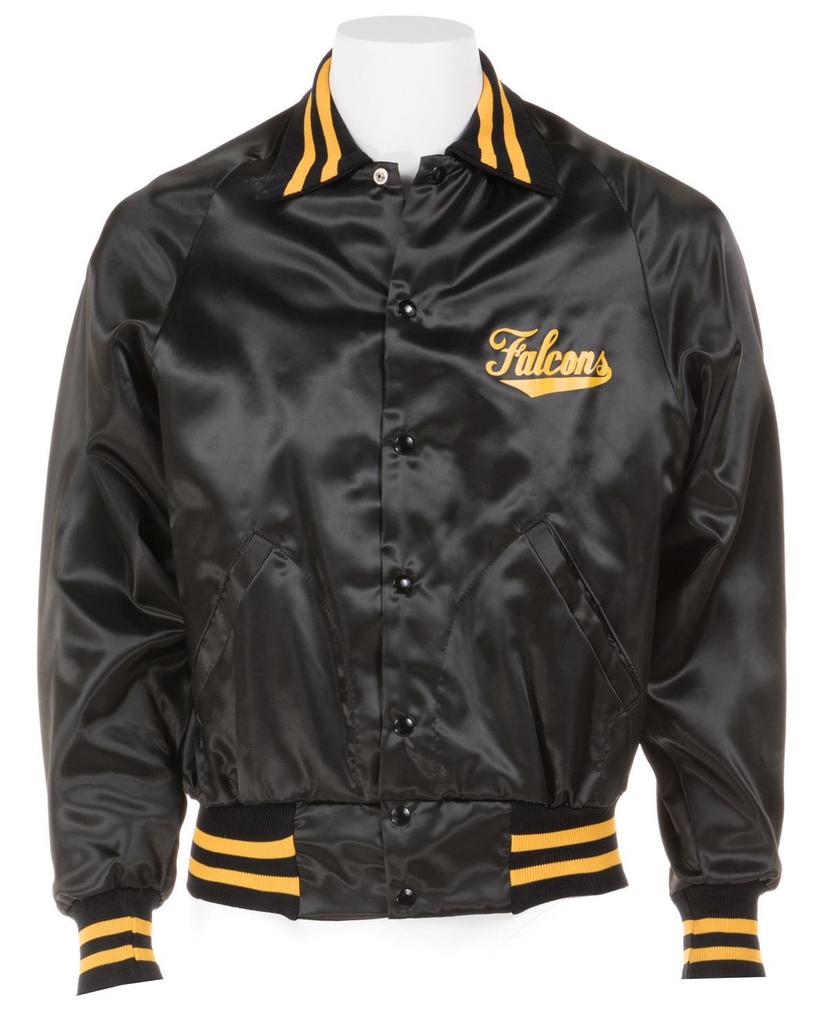 116. Falcons jacket from Happy Days Season 9, Episodes 1-2: "Home Movies".(ABC-TV, 1974-84) Vintage original black satin varsity athletic jacket with black and yellow knit pointed collar, cuffs and hem, yellow screen print "Falcons" on chest and back, 2-diagonal hip slash pockets, interior lined in white flannel, with snap button front closure.The Falcons were Fonzie's former gang. Exhibiting production wear and age with some makeup remnants. In vintage very good to fine condition. Provenance: Universal Studios Online Auction. $400 - $600
