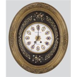 Pest, 19. sz. második fele, 1/2 -es ütos szerkezet, faragott, aranyozott keretben, gyöngyház berakással, jelzett: "Lechner Jos Pesten", muködoképes, kulcs hiányzik, m: 58 cm, muködoképes, kulcs hiányzik