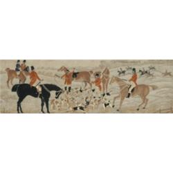 Vadászatot ábrázoló szövött kép eredeti keretében, 5 x 15 cm, Jelzett: Stevengraph, angol, XIX sz. vége