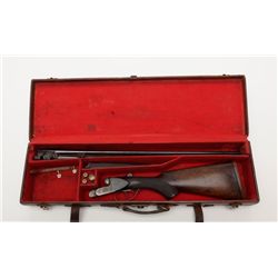Cased Belgian double rifle, Francotte-style action, 6.5mm cal., 26” barrels marked “Raick Freres” and “Liege, Belgium” with 4 stage flip-up rear si